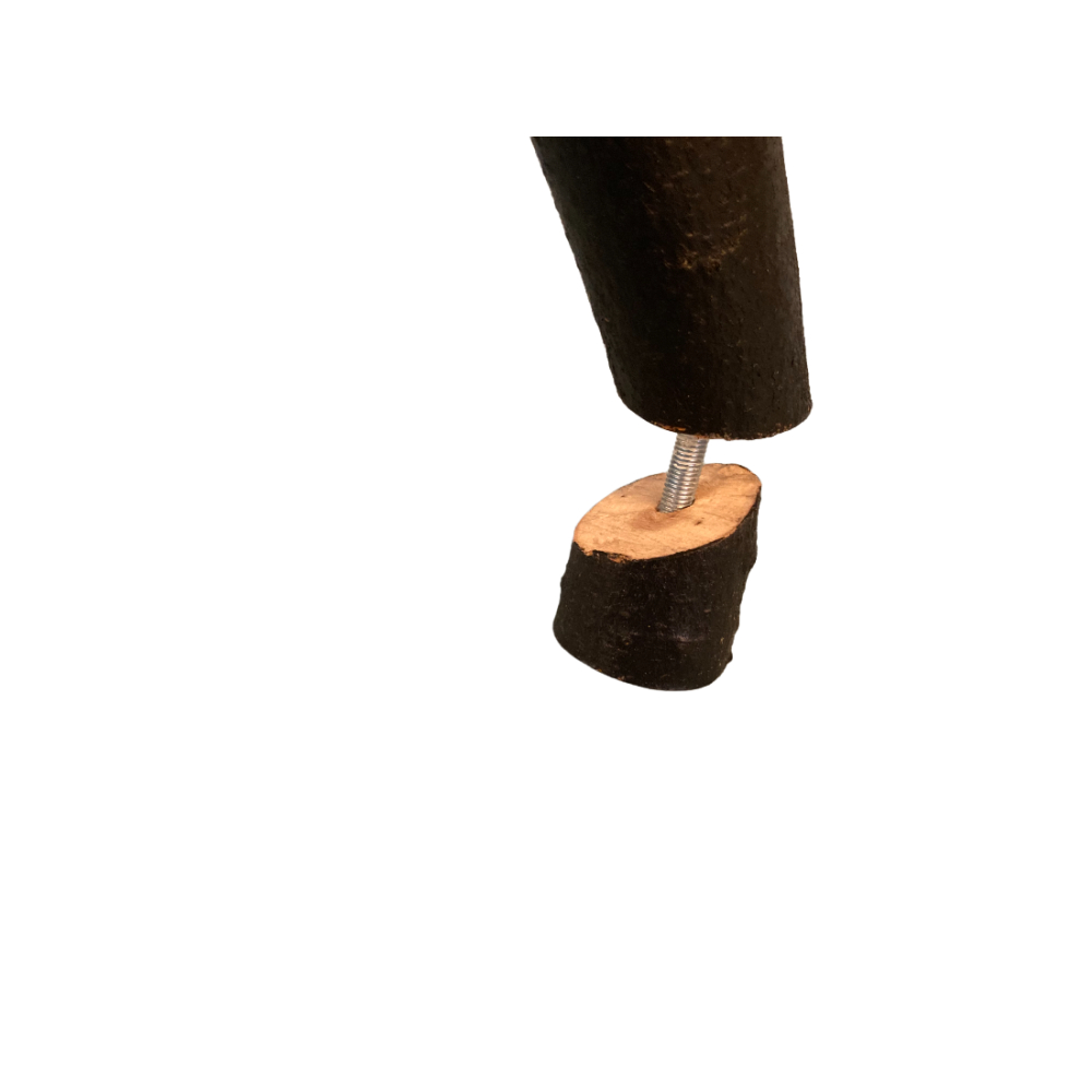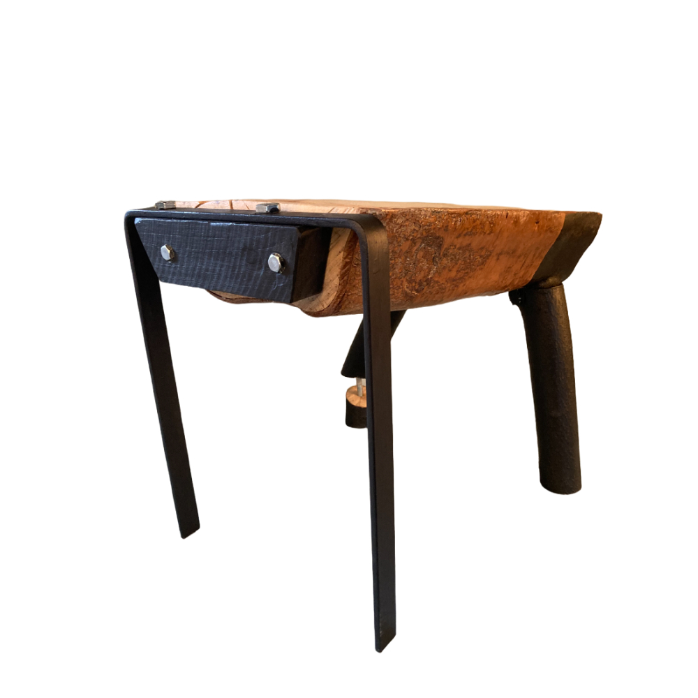 Dit grappige designtafeltje is gemaakt van een boomstam op 2 zwarte houten poten aan één kant en aan de andere kant matzwart oudijzer.