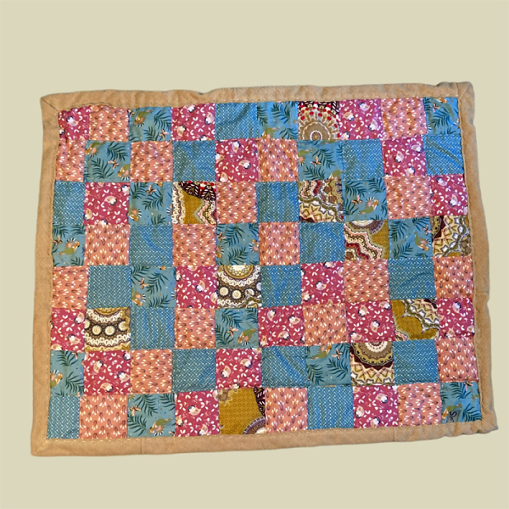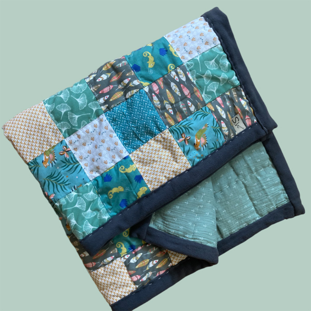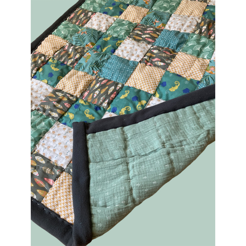 Hij is gemaakt van katoen, de achterkant is van katoenen hydrofiel.