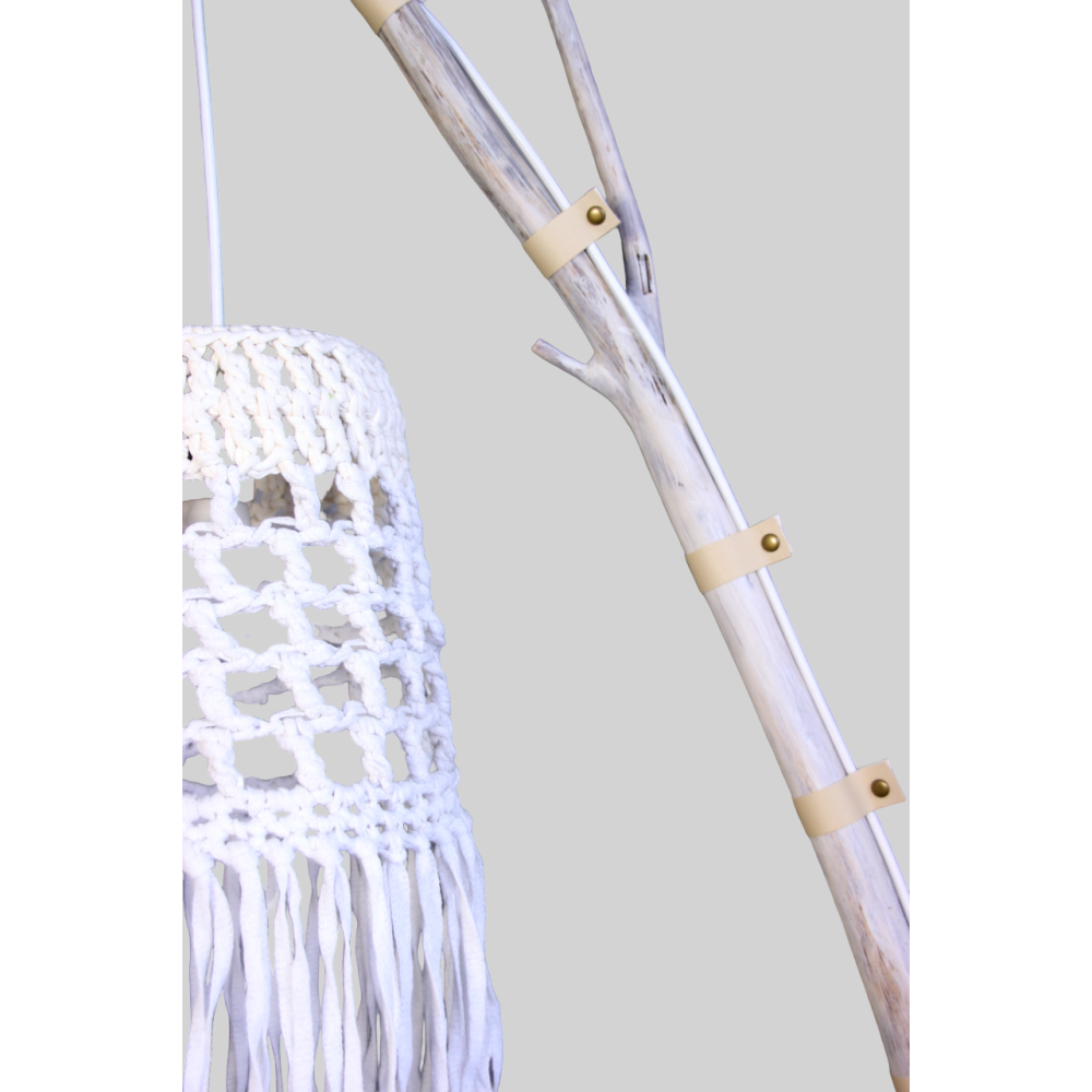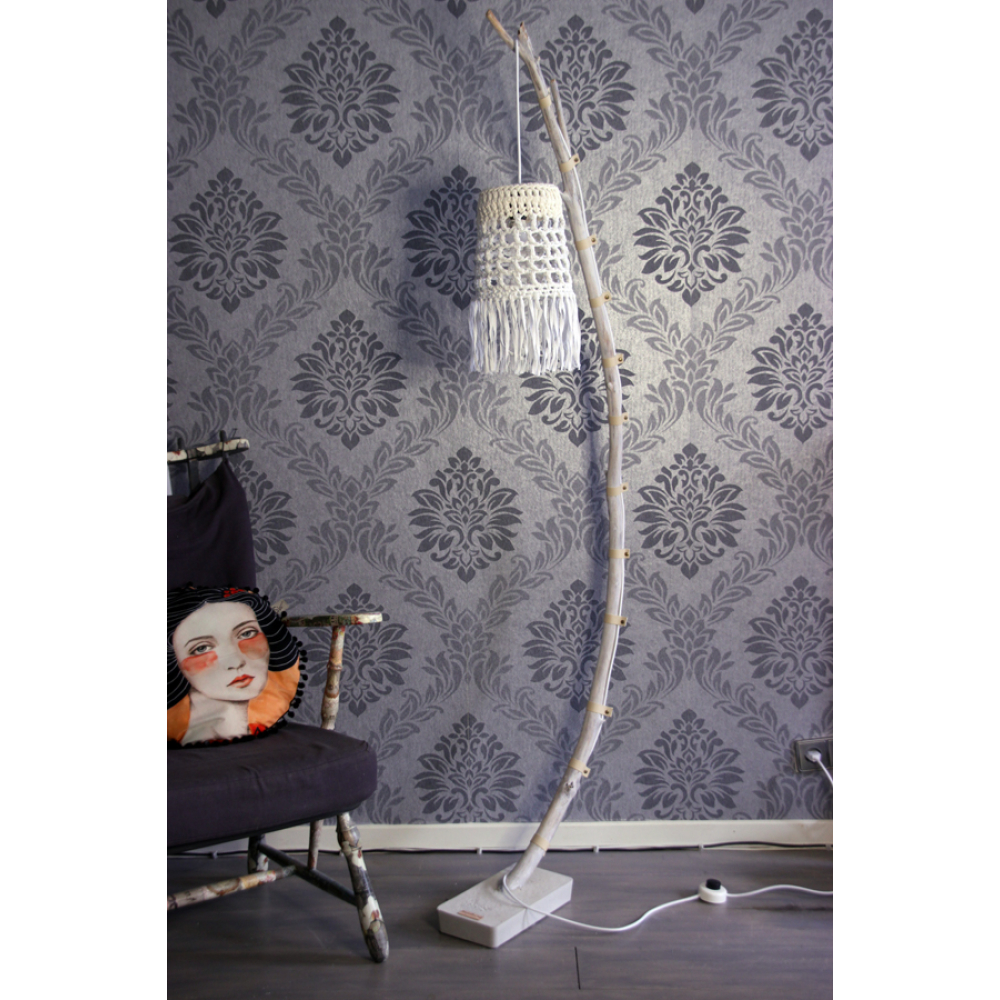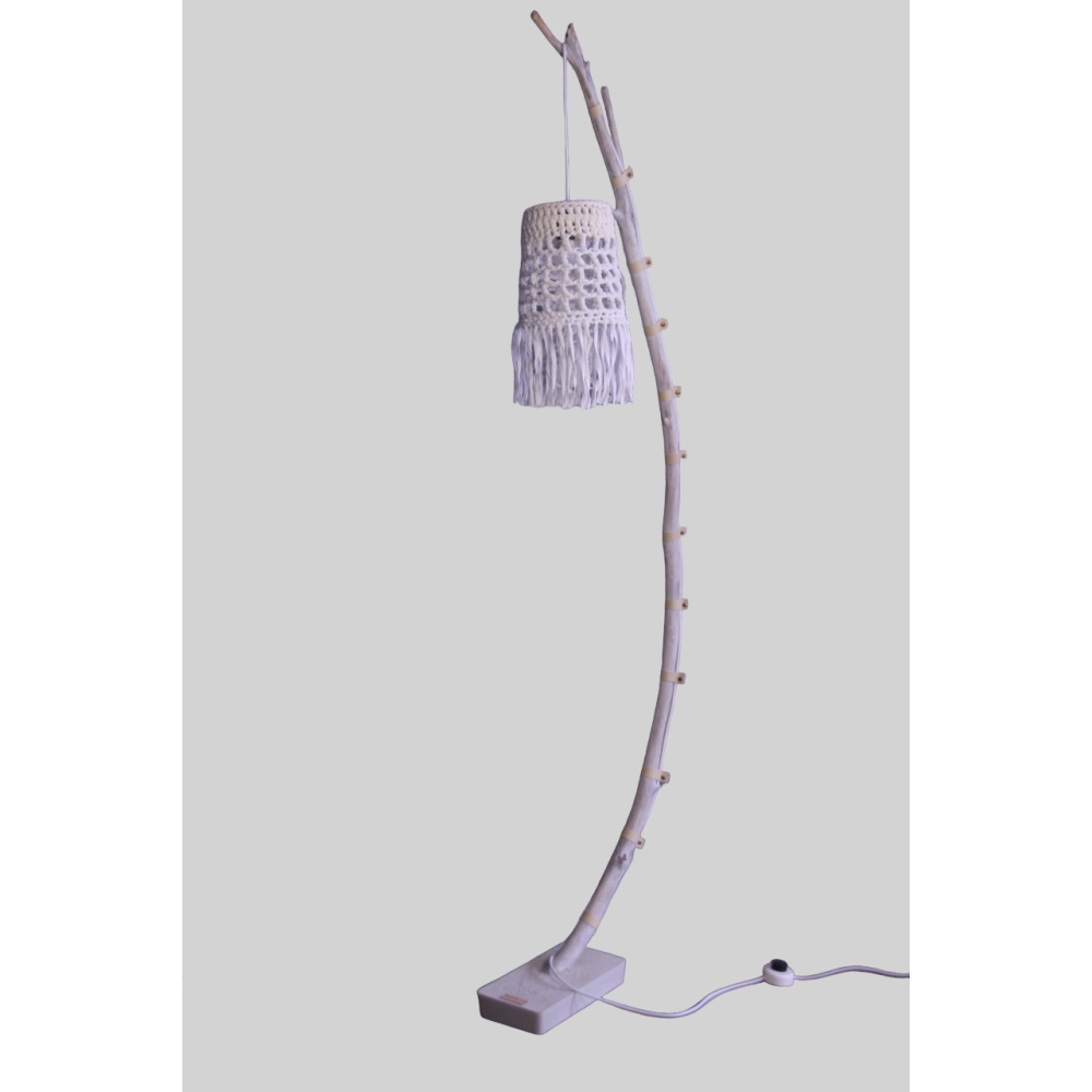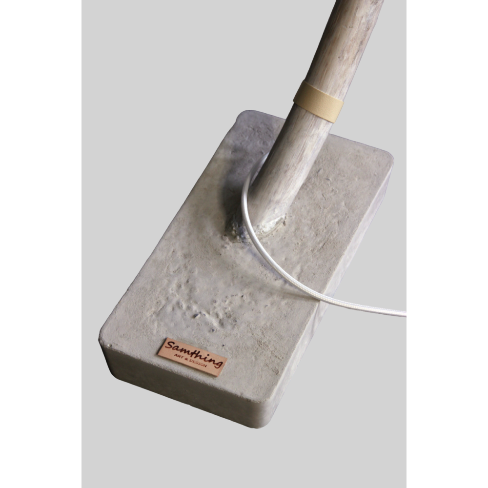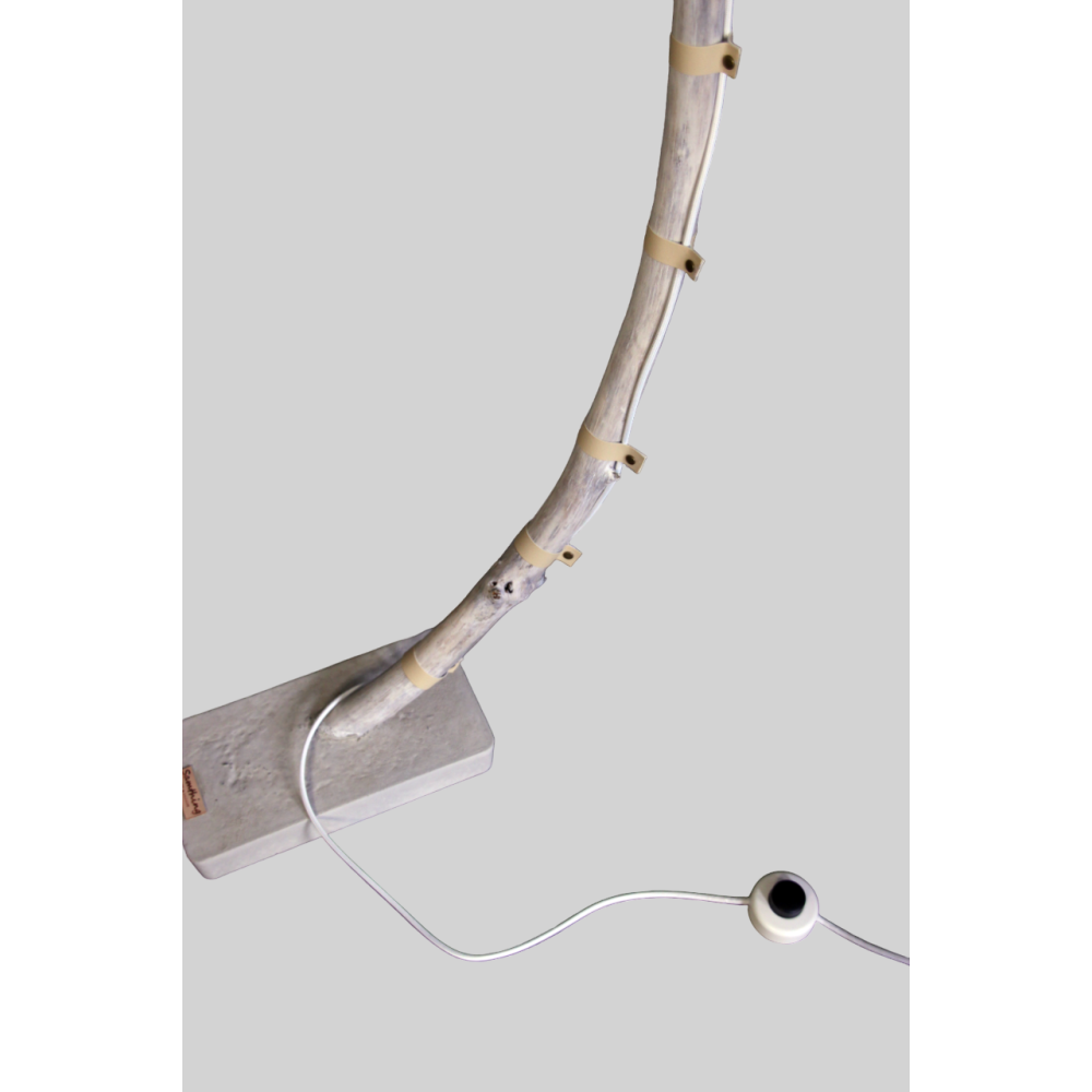 Deze booglamp is gemaakt van een houten tak in whitewash, in beton gegoten.