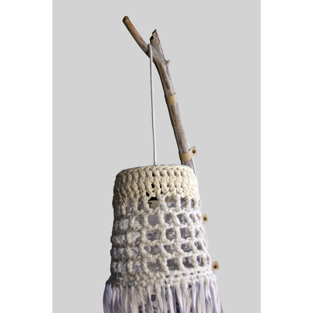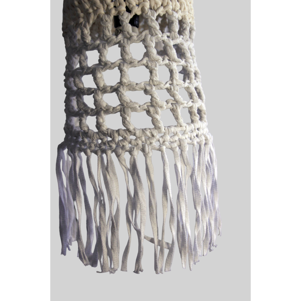 De lampenkap is gemaakt van gerecyclede ribbon in de kleuren wit en off-white.