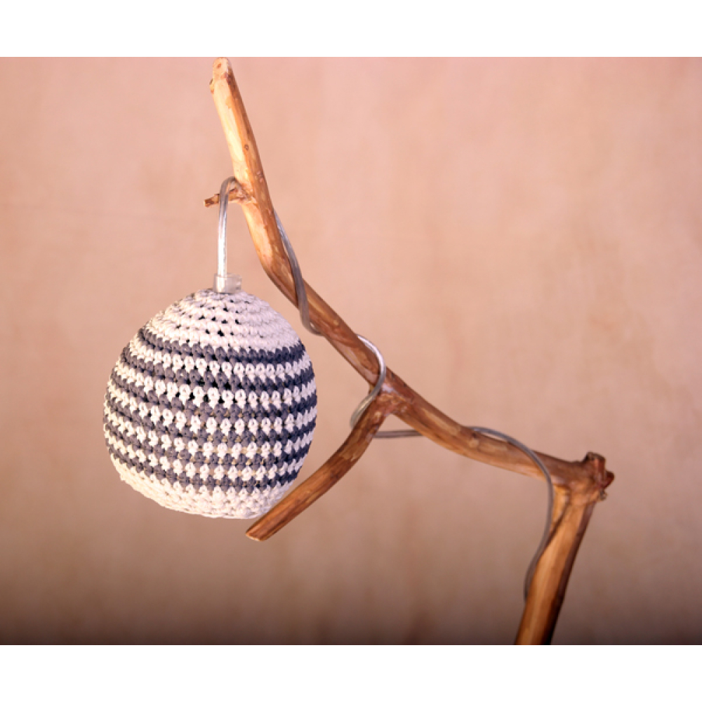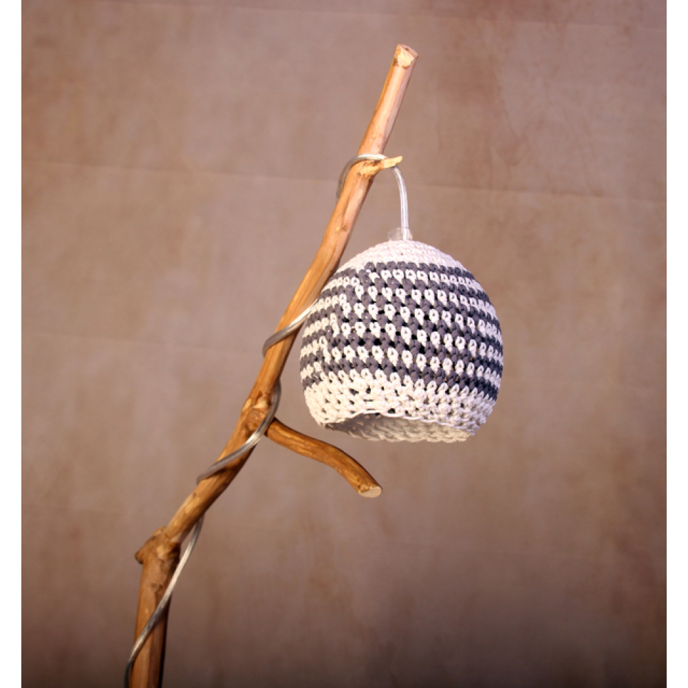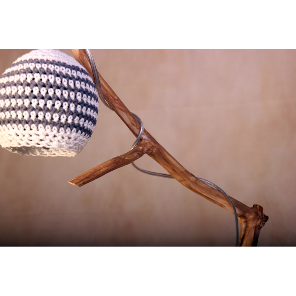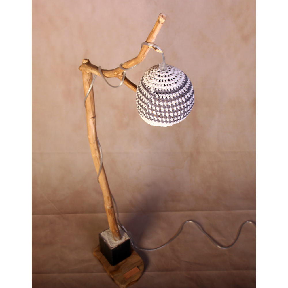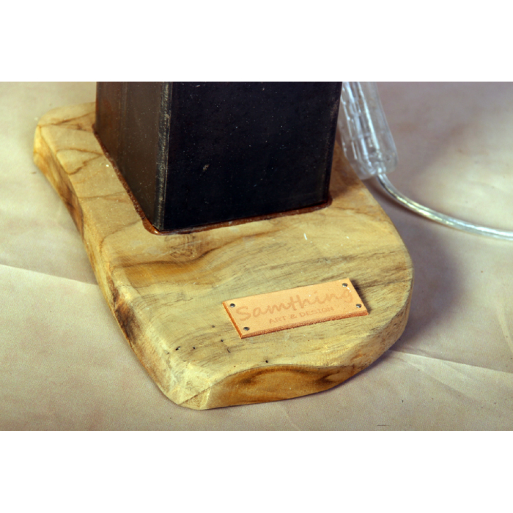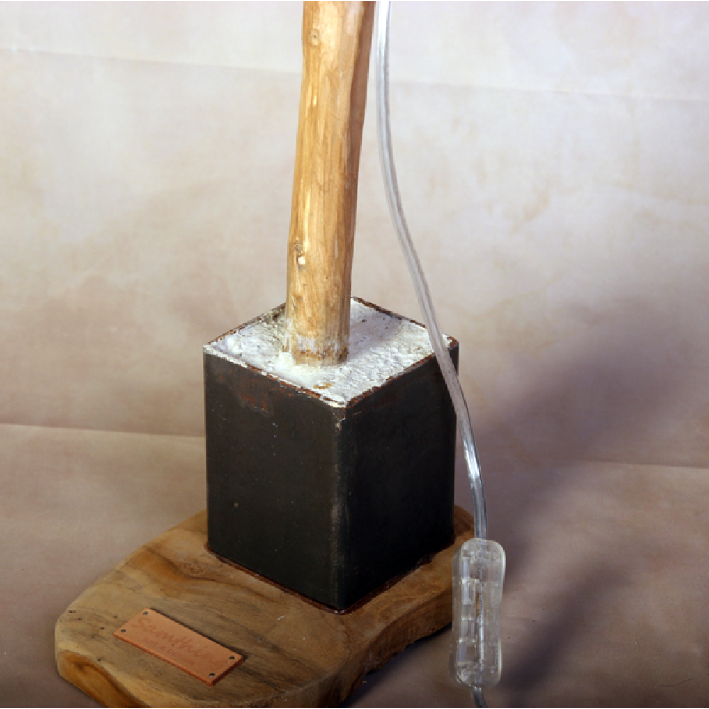 Houten plateau met stalen bakje gevuld met beton en tak.