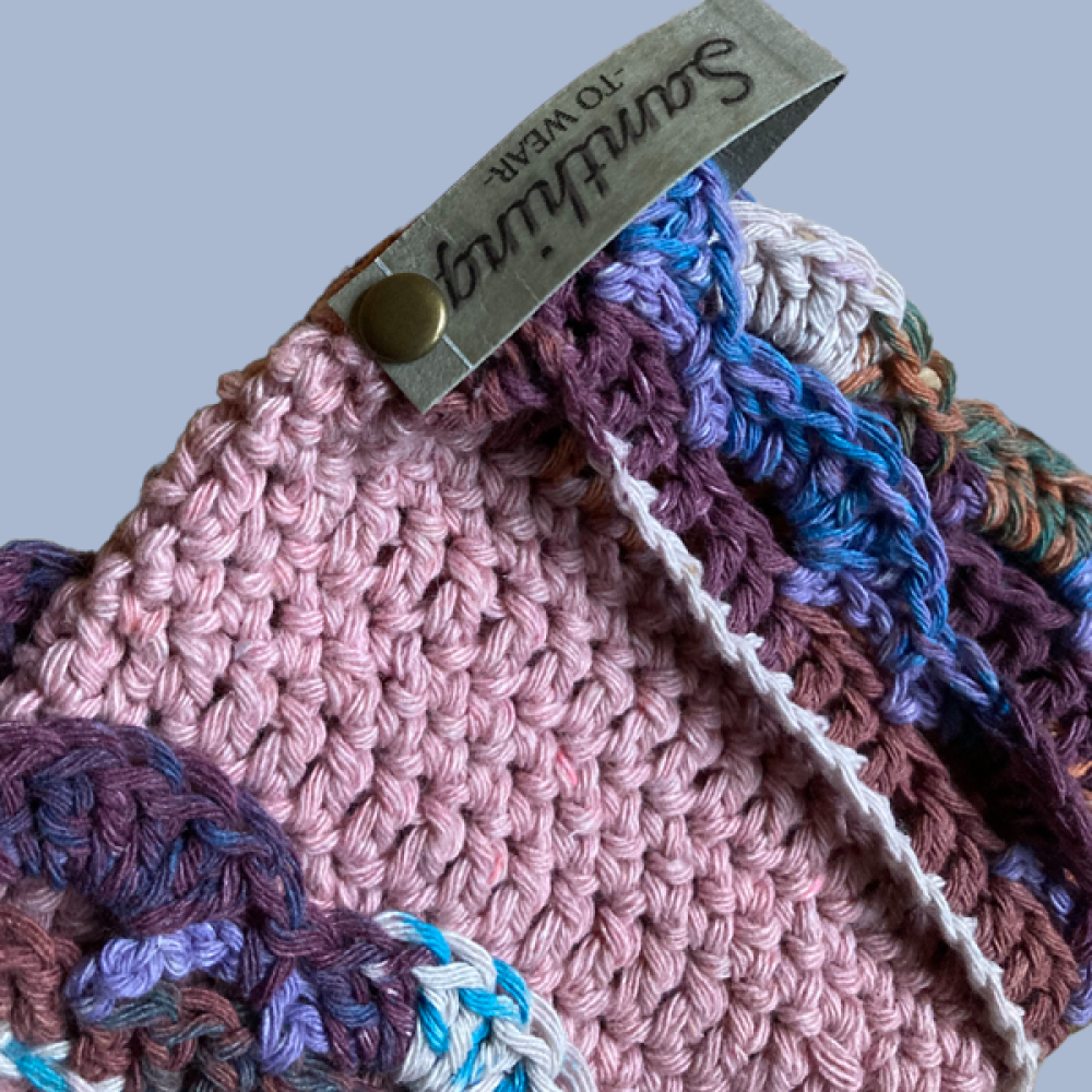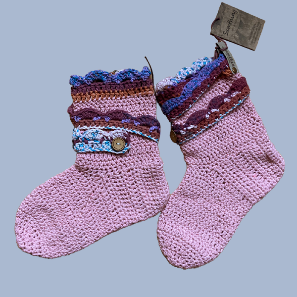 Gehaakte sloffen gemaakt van gerecyclede katoen.