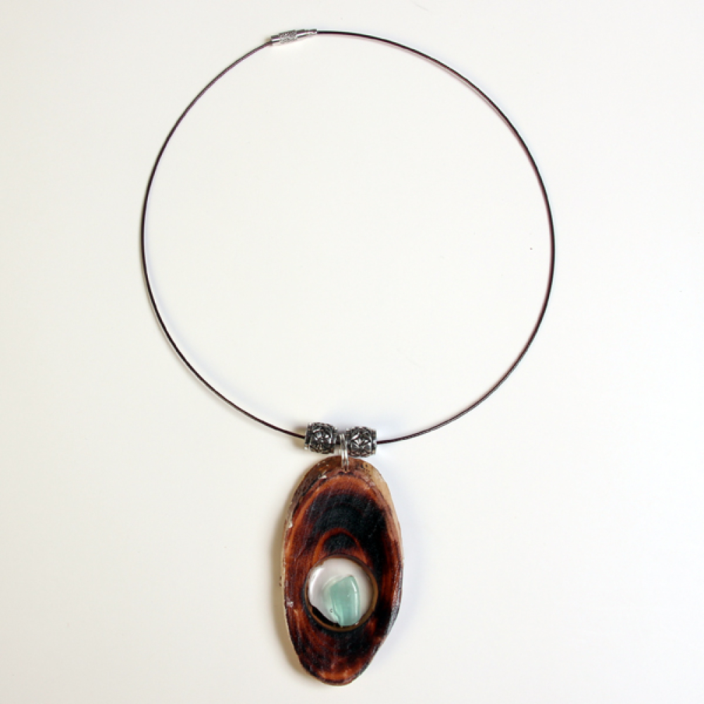 Pendule gemaakt van boomstammetje met resin art, met daarin een steentje of kraal.