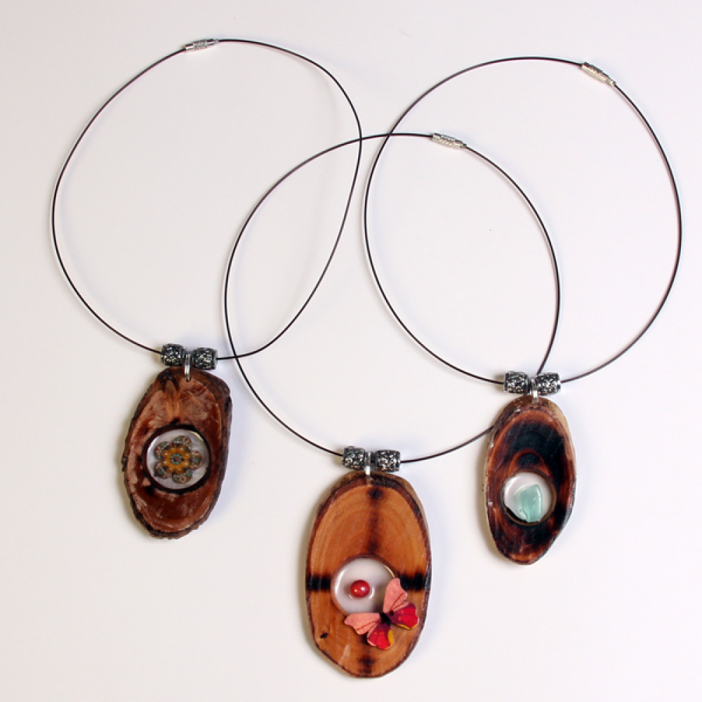 Pendule gemaakt van boomstammetje met resin art, met daarin een steentje of kraal.