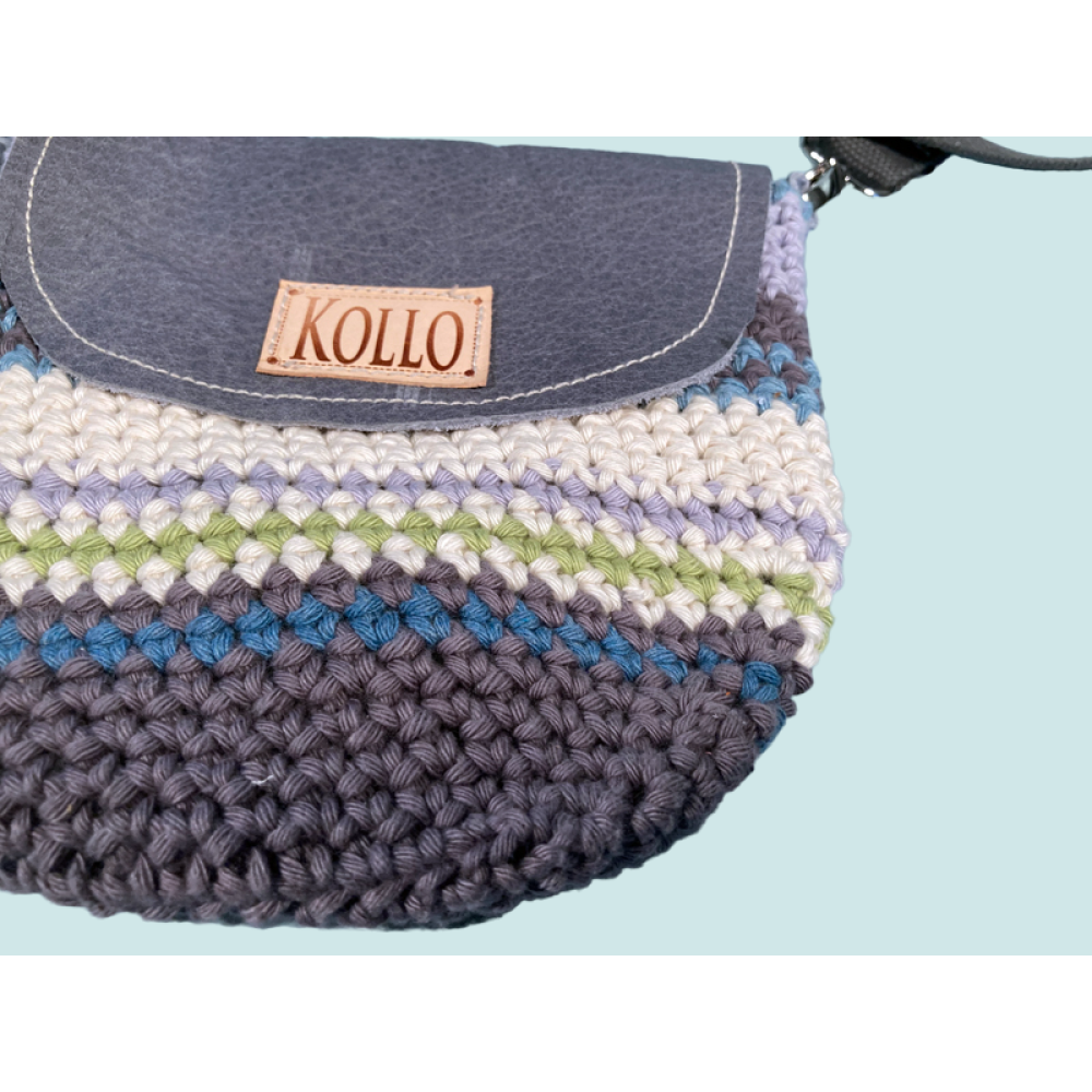 Hij is gehaakt van katoenen garen en heeft een klep van leder met magneetsluiting en is voorzien van voering.