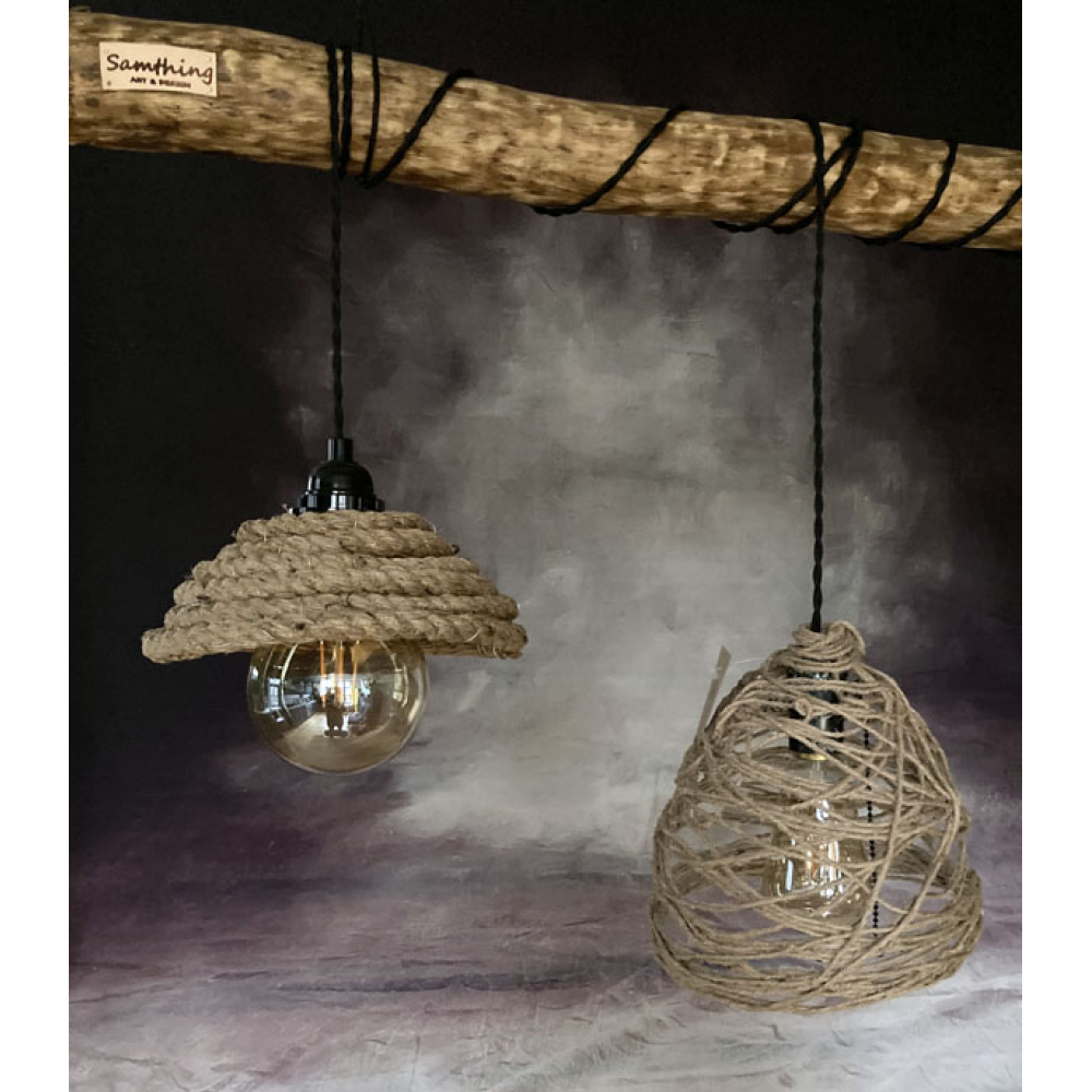 De handmade lampenkappen zijn gemaakt van jutetouw.