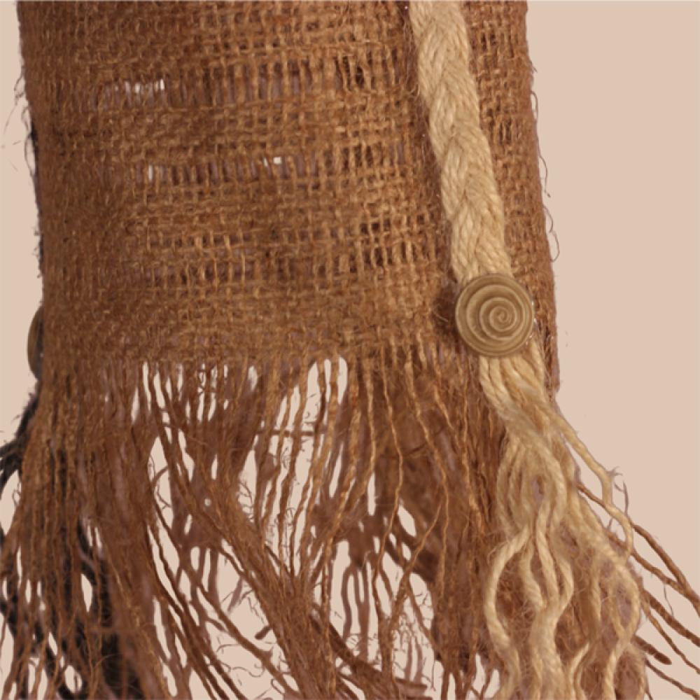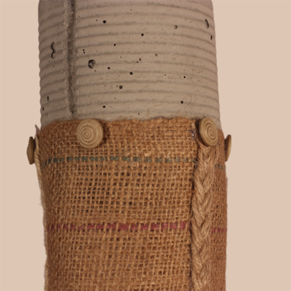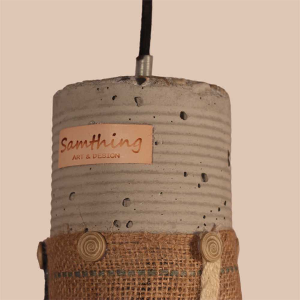 Deze lamp heeft een natuurlijke uitstraling en is gemaakt van beton met jute en knoopjes.