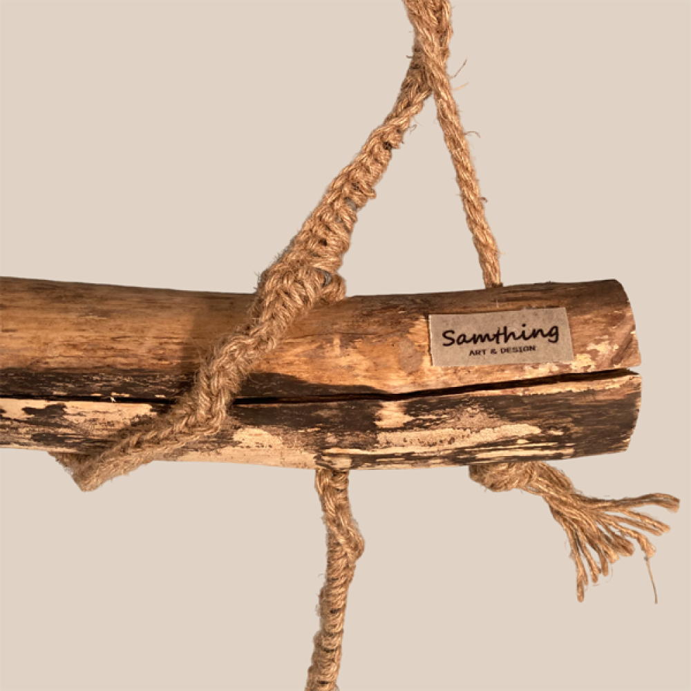 Lamp met natuurlijke uitstraling van boomstam met snoeren van jute en 3 kappen van gehaakte jute.