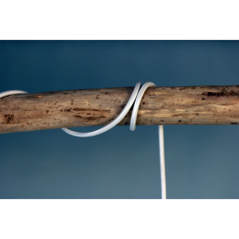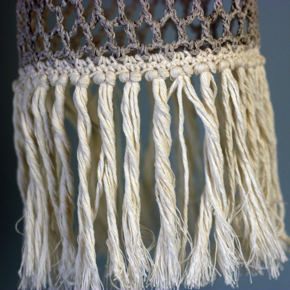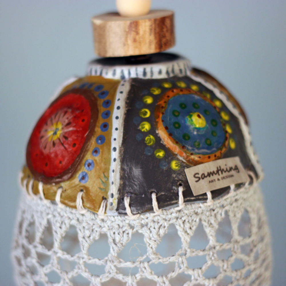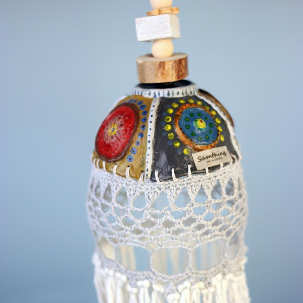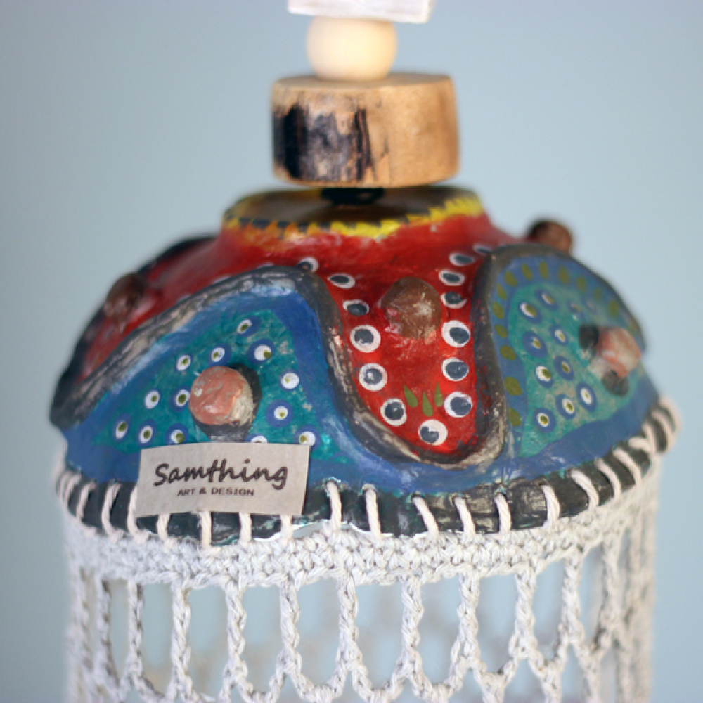 Boomstam met 2 kapjes (met de hand gekleid en beschilderd) aan wit strijkijzersnoer, met haakwerk en franjes.