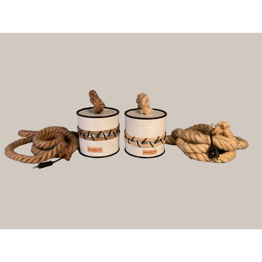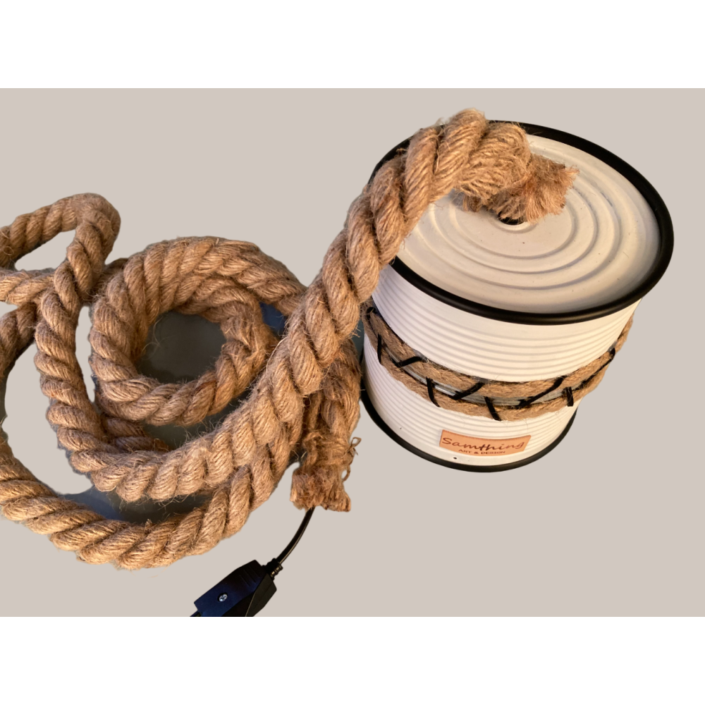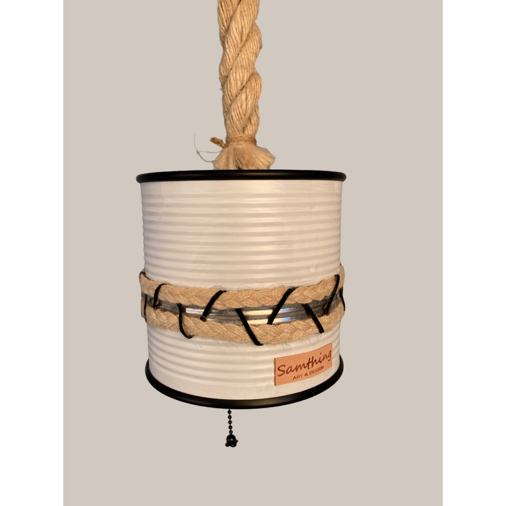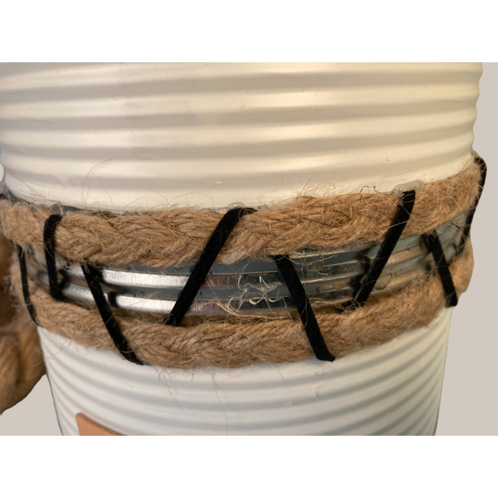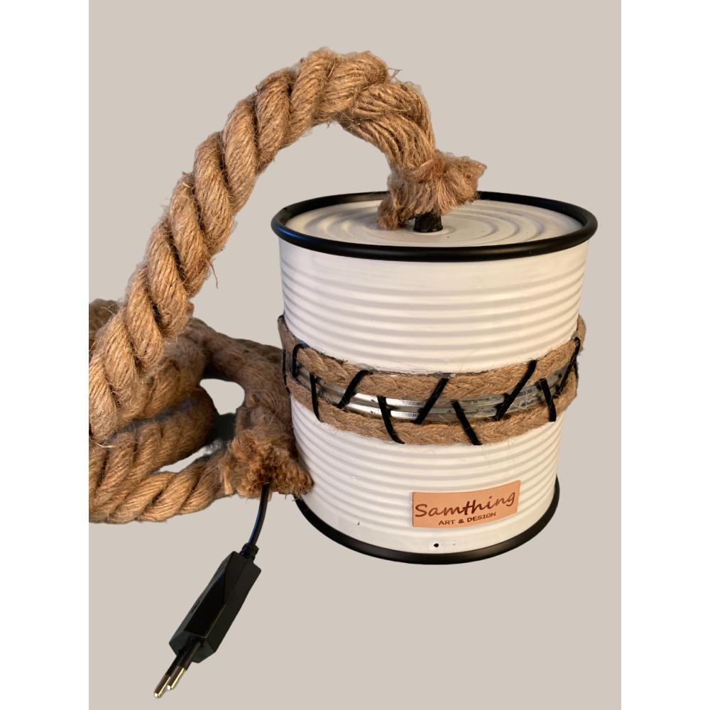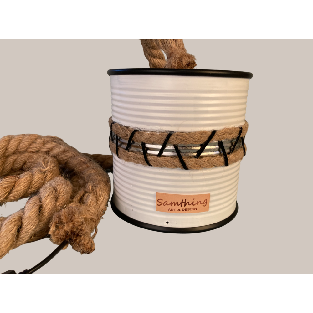 Hij bestaat uit wit geverfde blik met grof jute touw als snoer.