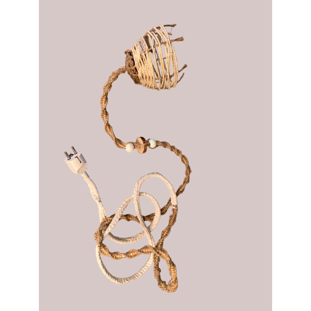 Hij heeft een kap van jute touw en een snoer van macramé touw en katoenen koord.