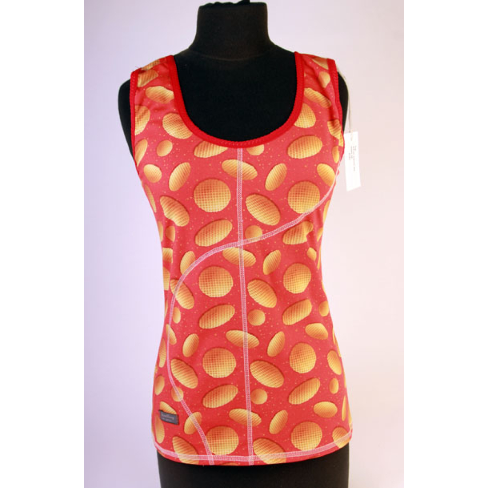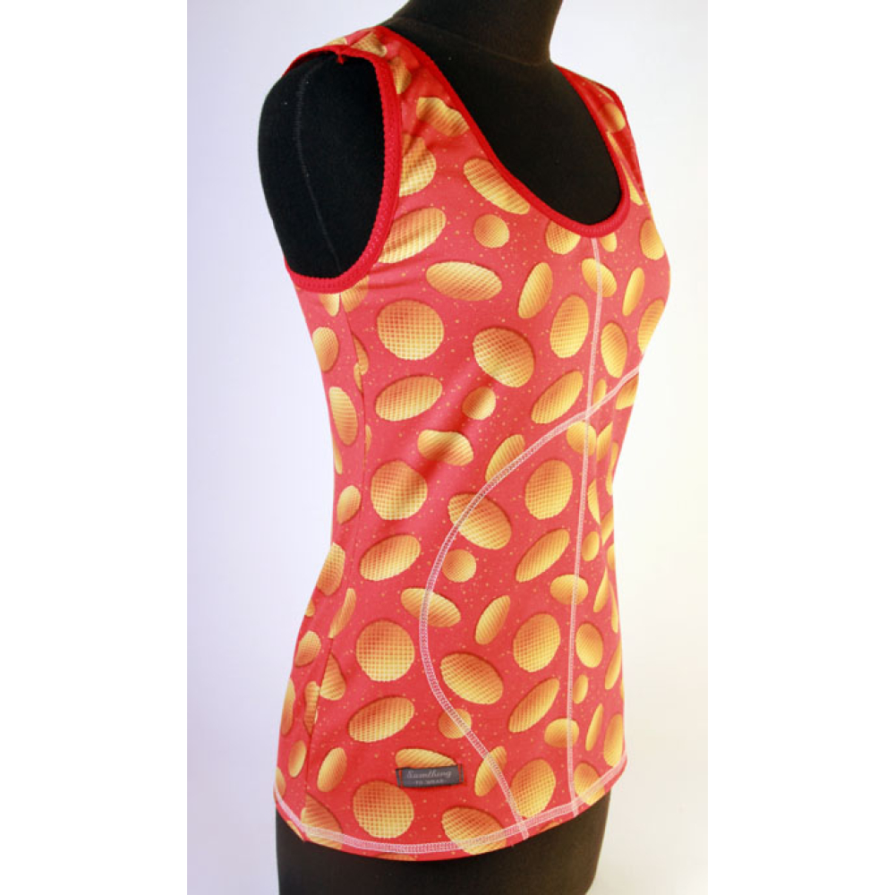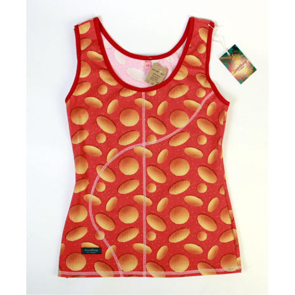 Hemdje, getailleerd, afgewerkt met rood elastische bies en sierstiksels.