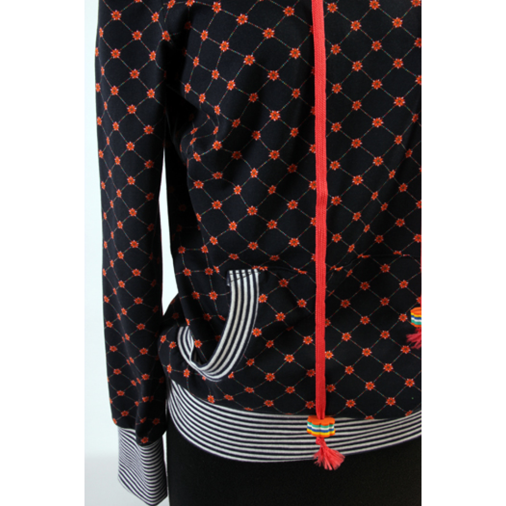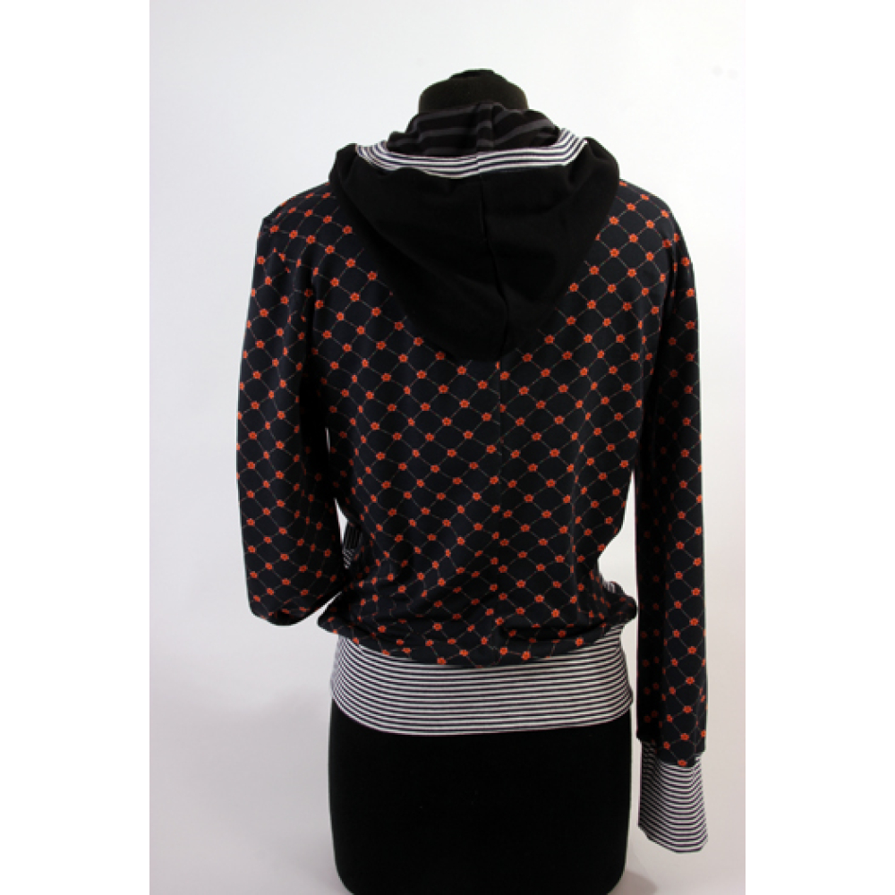Kleur: donkerblauw, framboos, capuchon: zwart