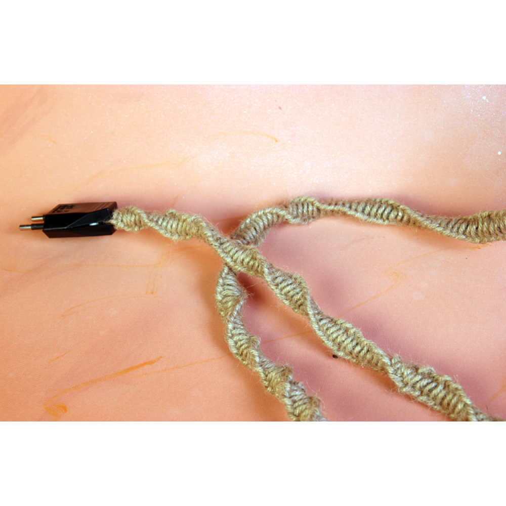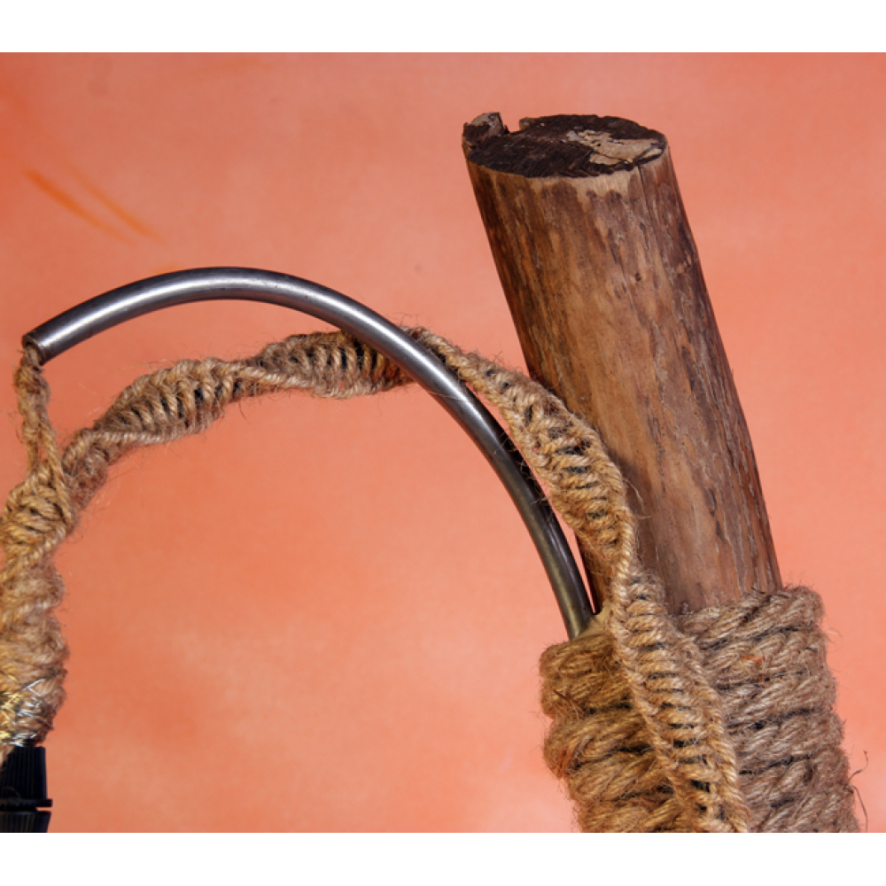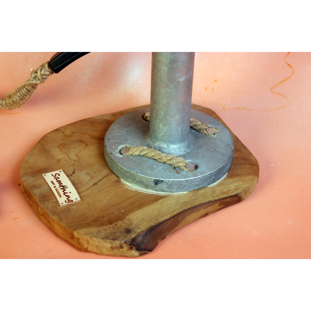 De boomstam die in een ijzeren houder op een houten plateau staat is omwikkeld met dik macramé hennepsnoer.