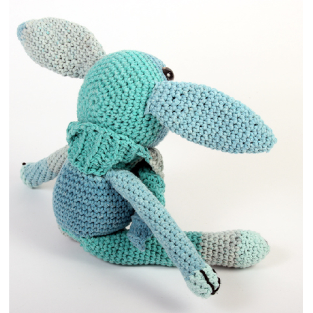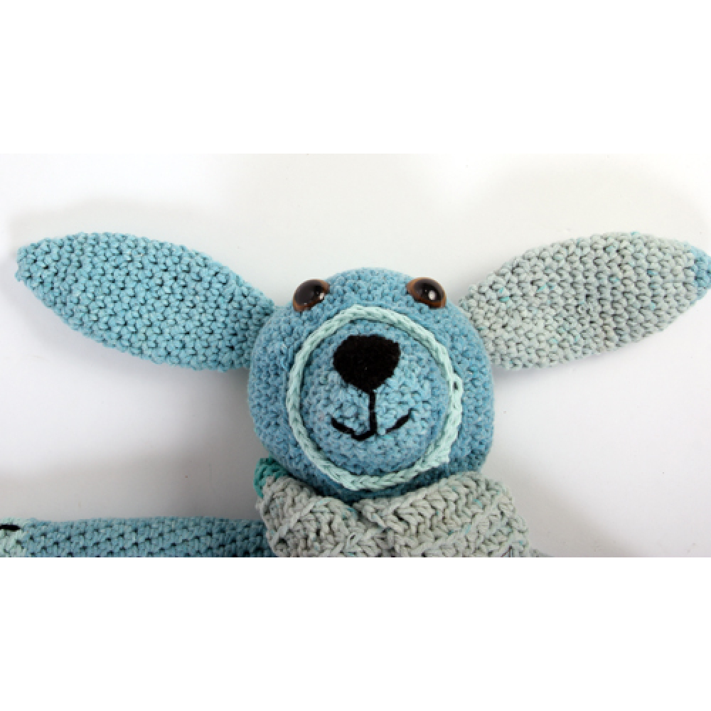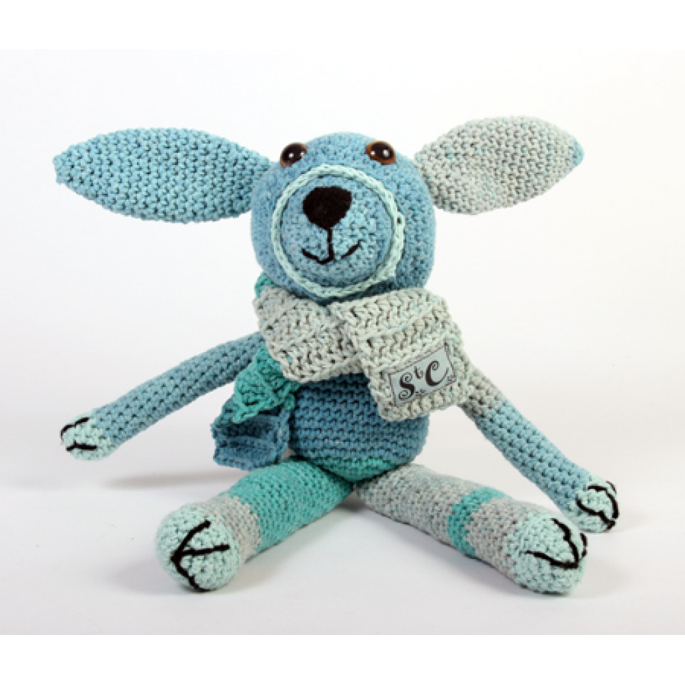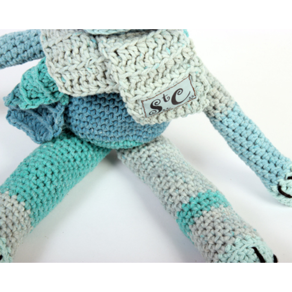 Timmy is gehaakt van zachte babygaren (50% kat 50% acryl) in blauw/ groentinten, met sjaaltje, 40cm, vulling polyester