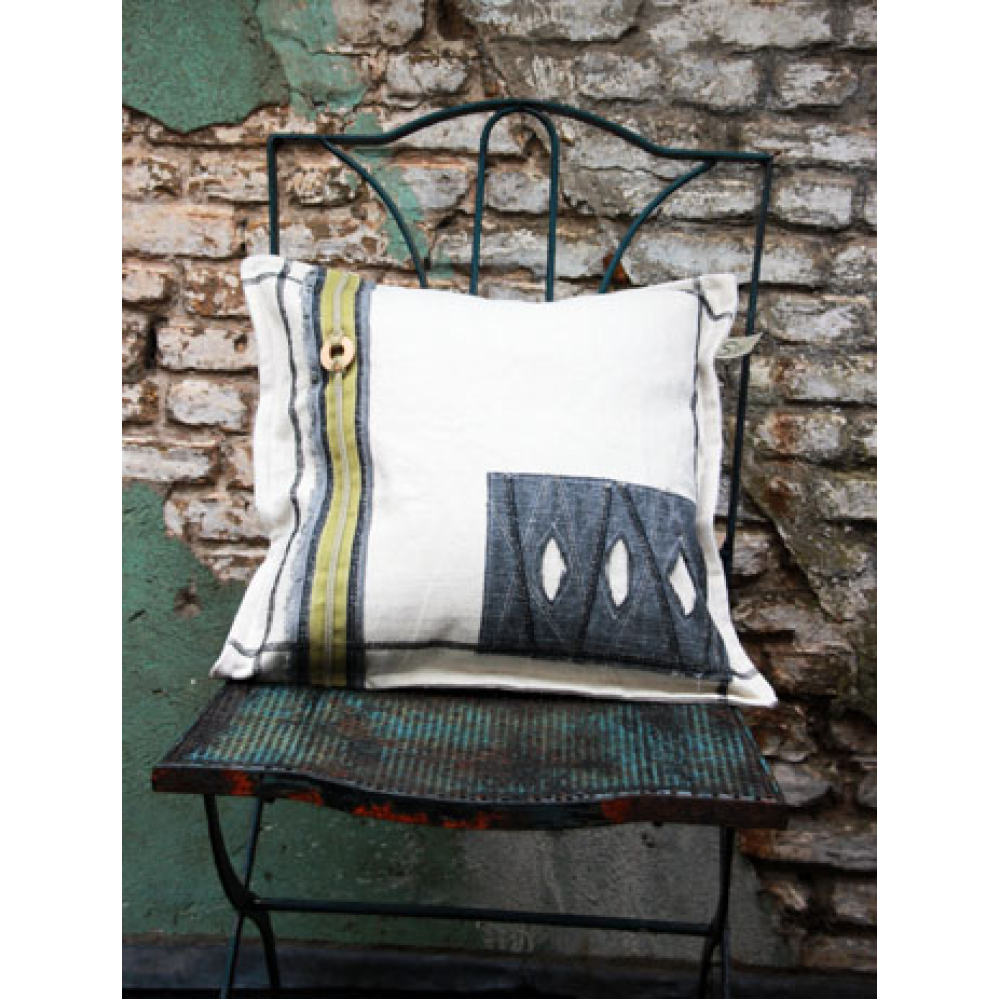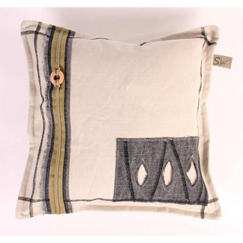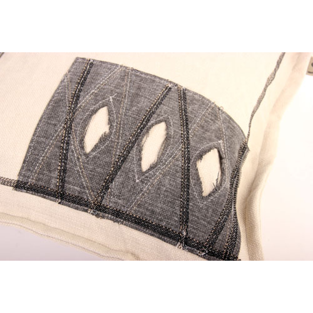 Stoer sierkussen van canvas met een robuuste uitstraling door de opgestikte stukken, band en sierstiksels en rafelige randen.