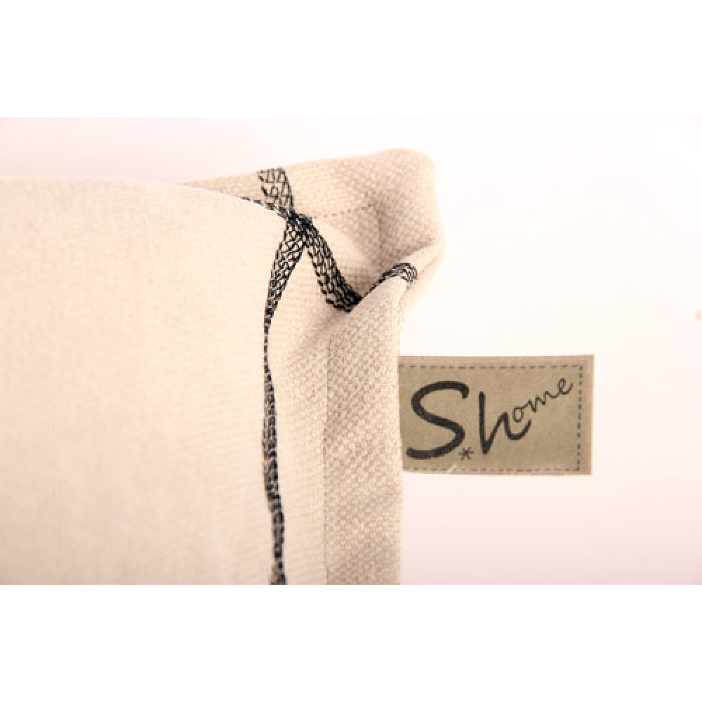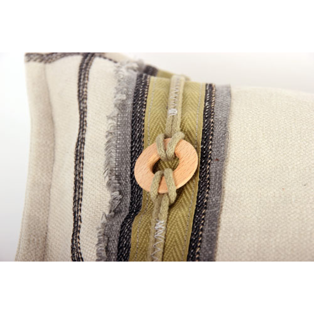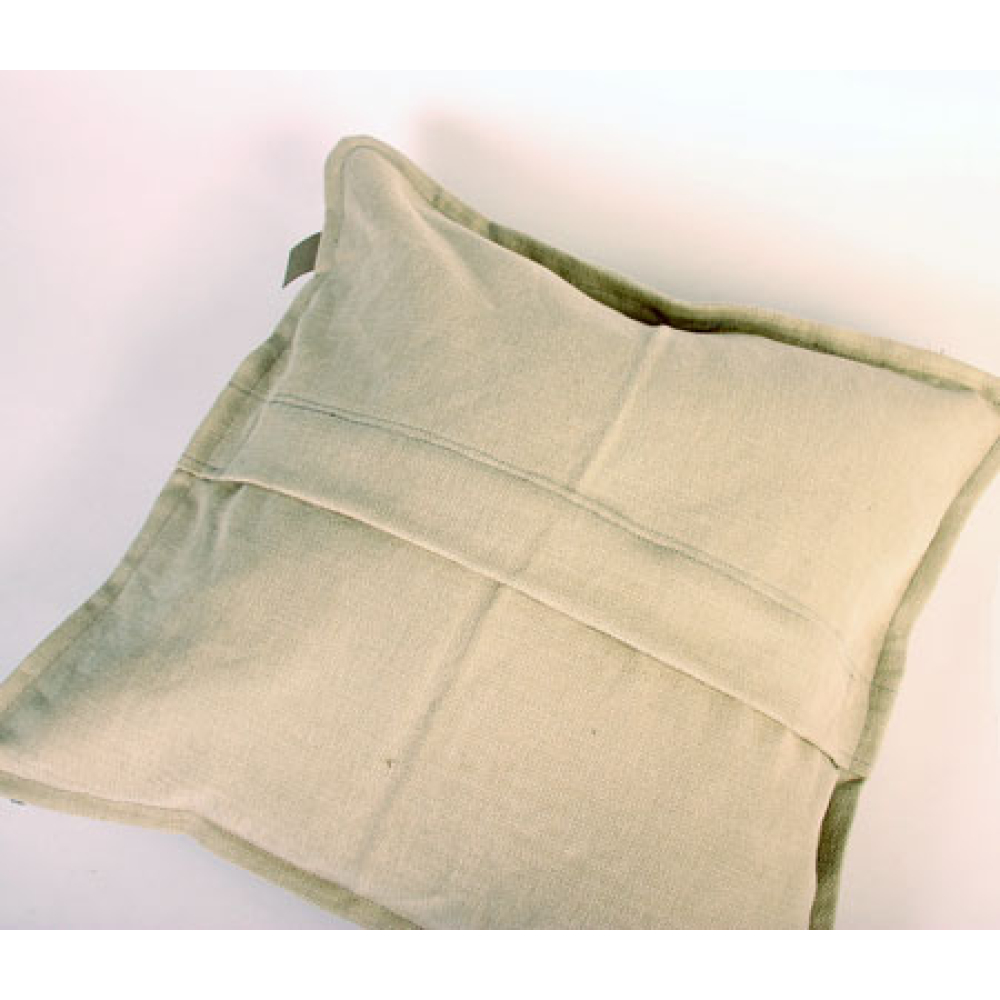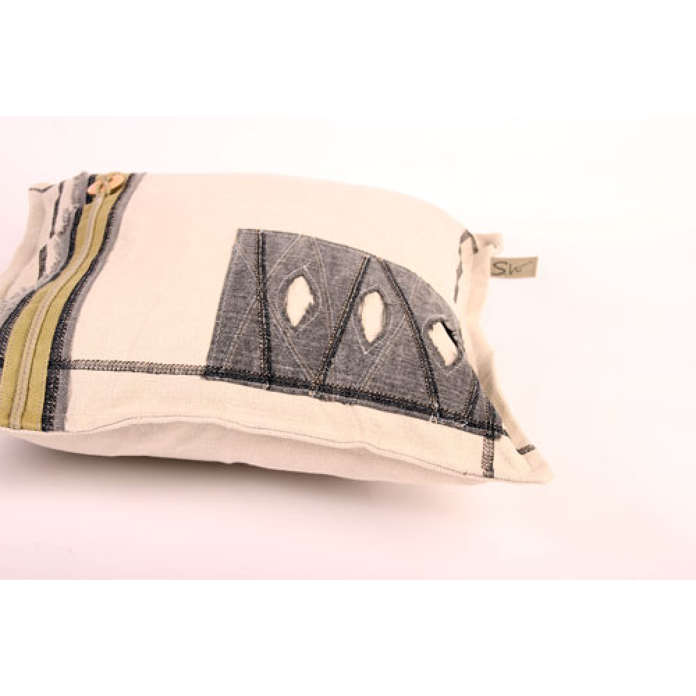 Stoer sierkussen van canvas met een robuuste uitstraling door de opgestikte stukken, band en sierstiksels en rafelige randen.