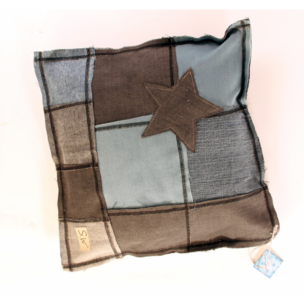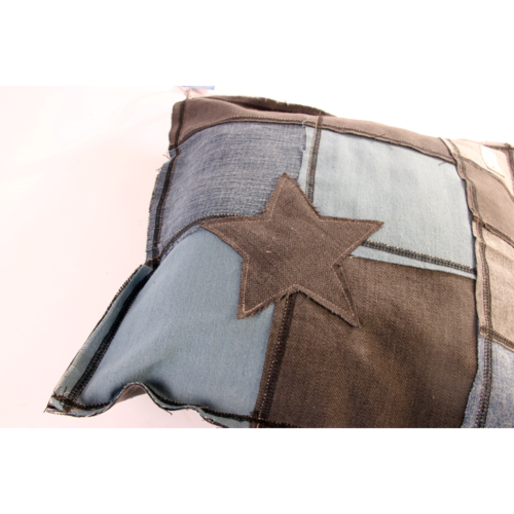 Stoer sierkussen van canvas en used denim in patchwork stijl met een robuuste uitstraling door de opgestikte stukken, sierstiksels en rafelige randen. Met donkergrijze opgestikte ster.