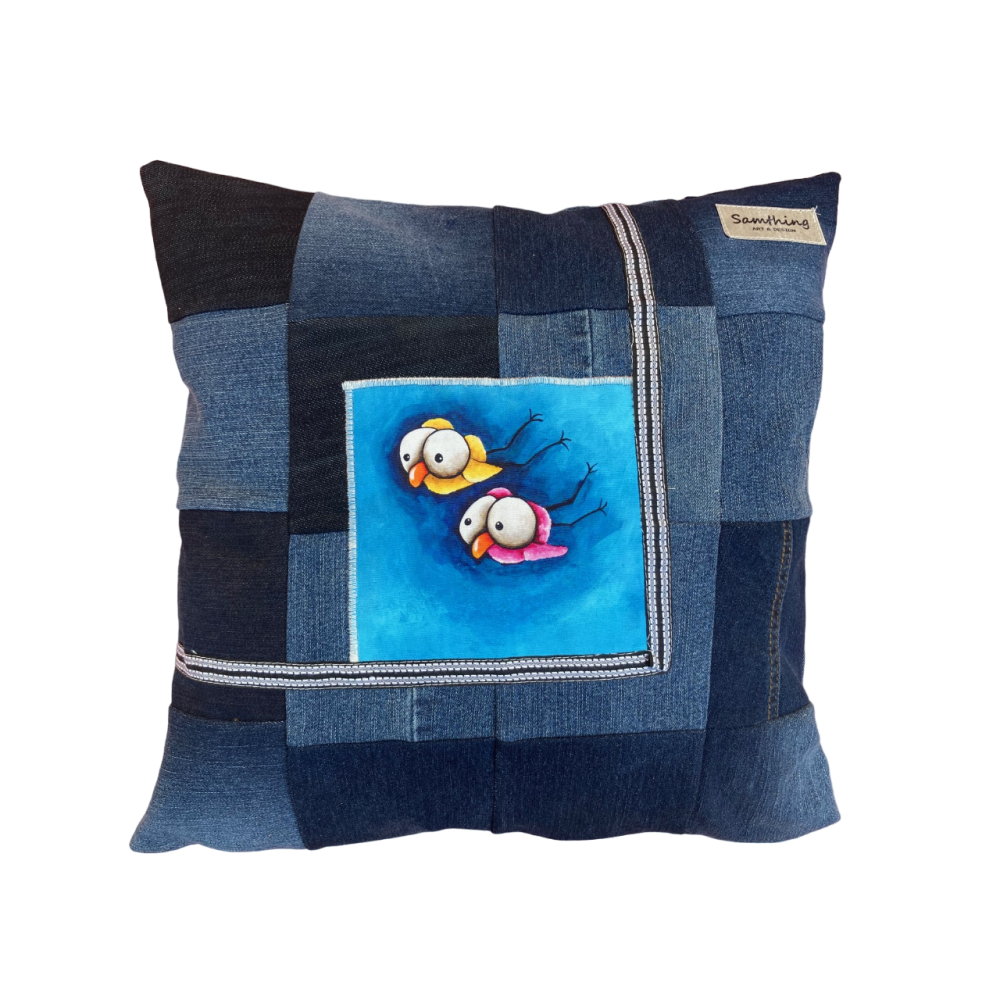 Op de voorkant een canvas print met een grappig vogeltje en op de achterkant een zak.