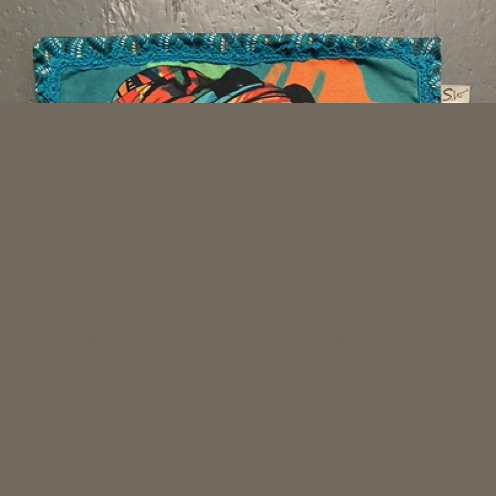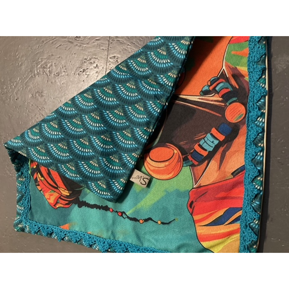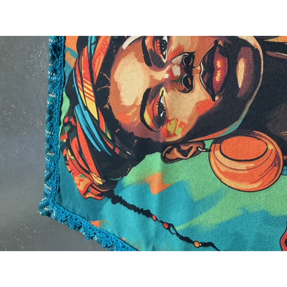 Kussen gemaakt van gobelin stof met afbeelding vrouw en met de hand gehaakte sierrand.