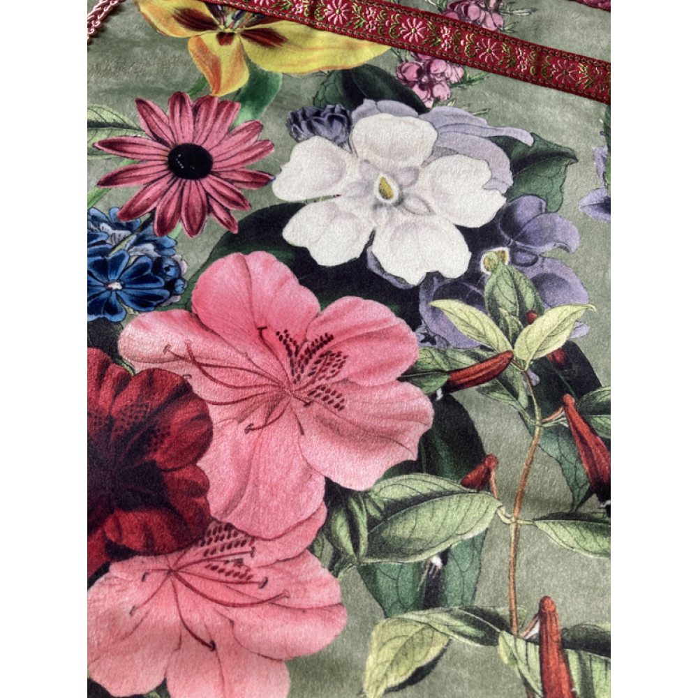 Kussenhoes van fluweelachtige stof met bloemenprint.