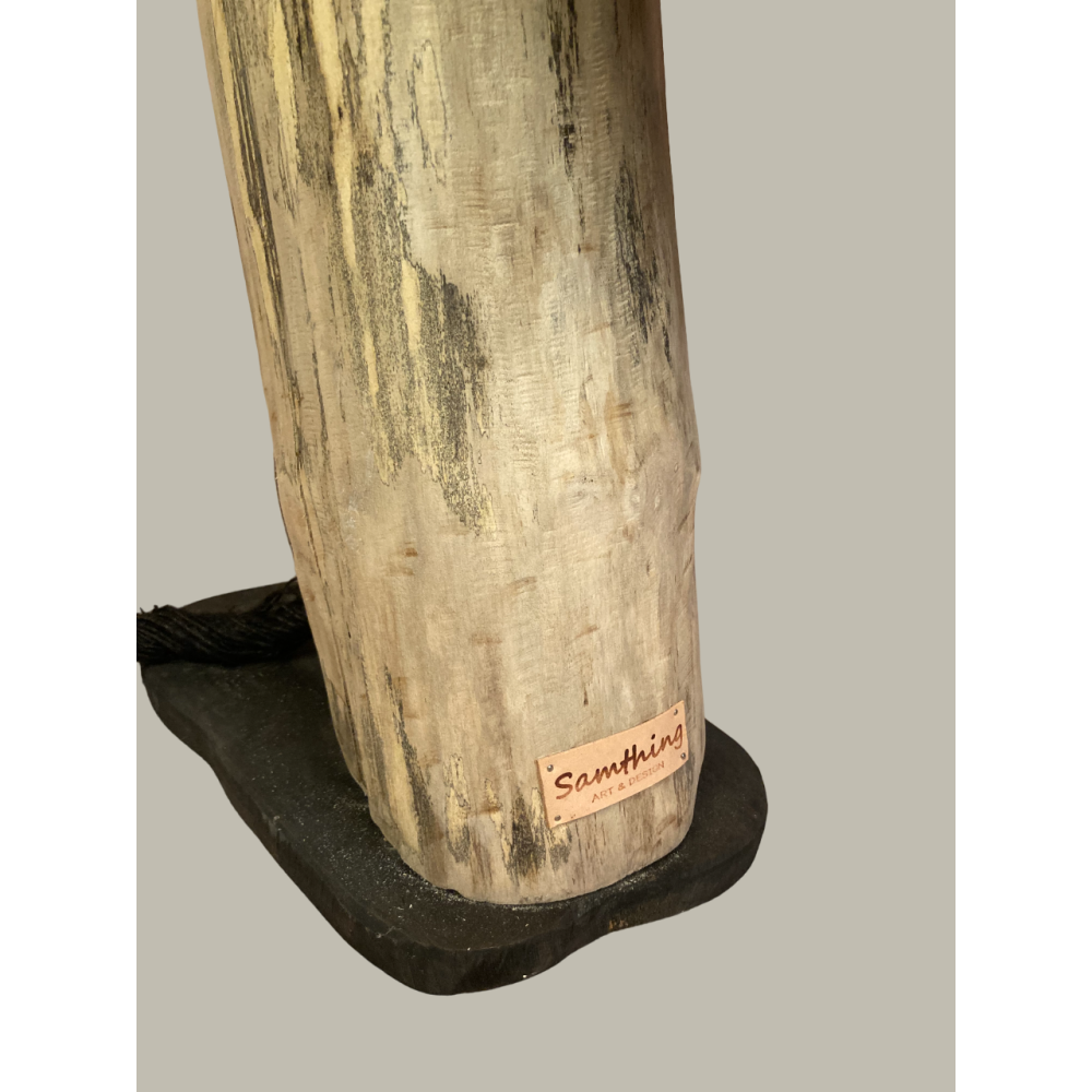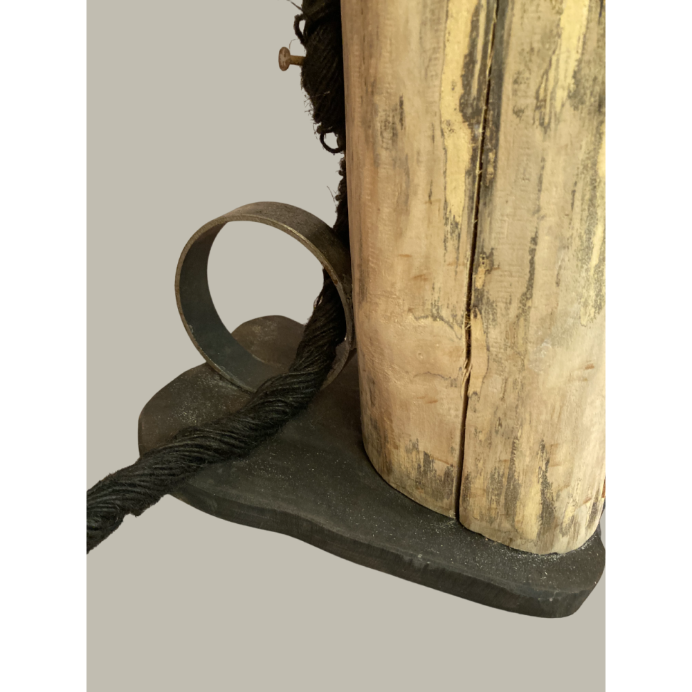 Boomstam op houten plateau met stalen buisje en cirkel van oudijzer.