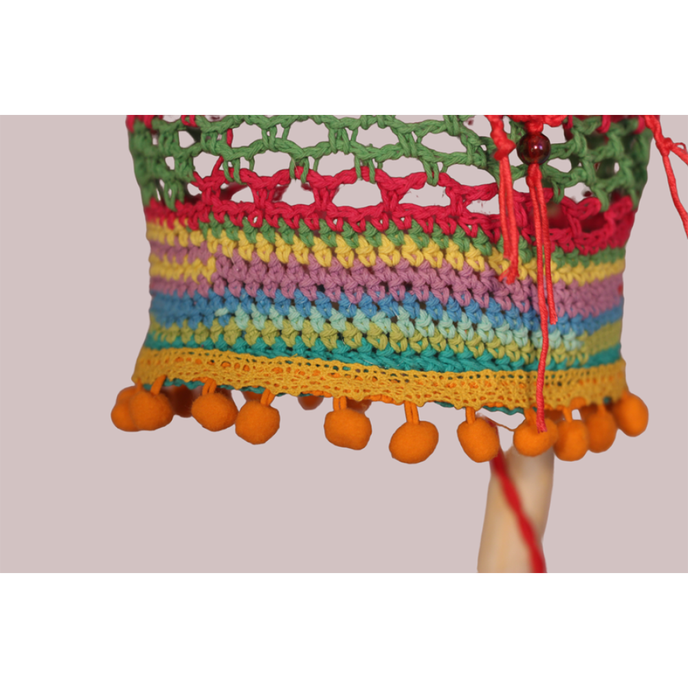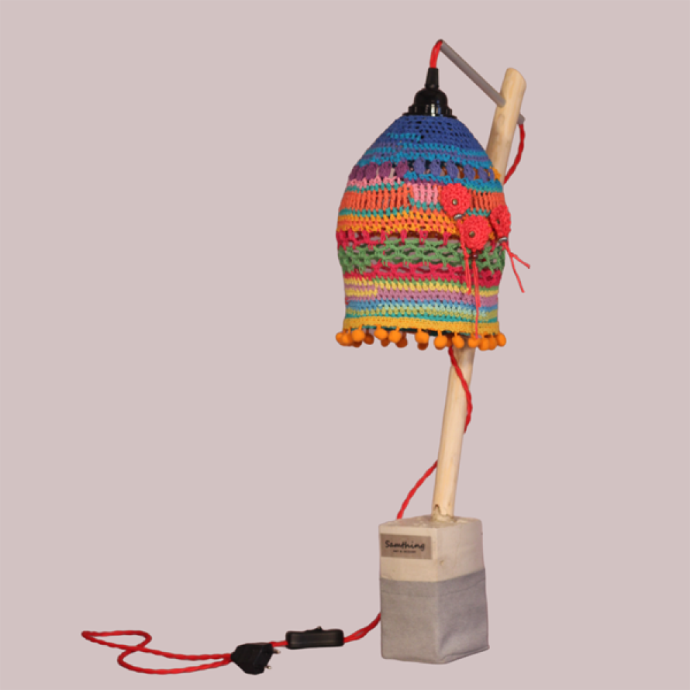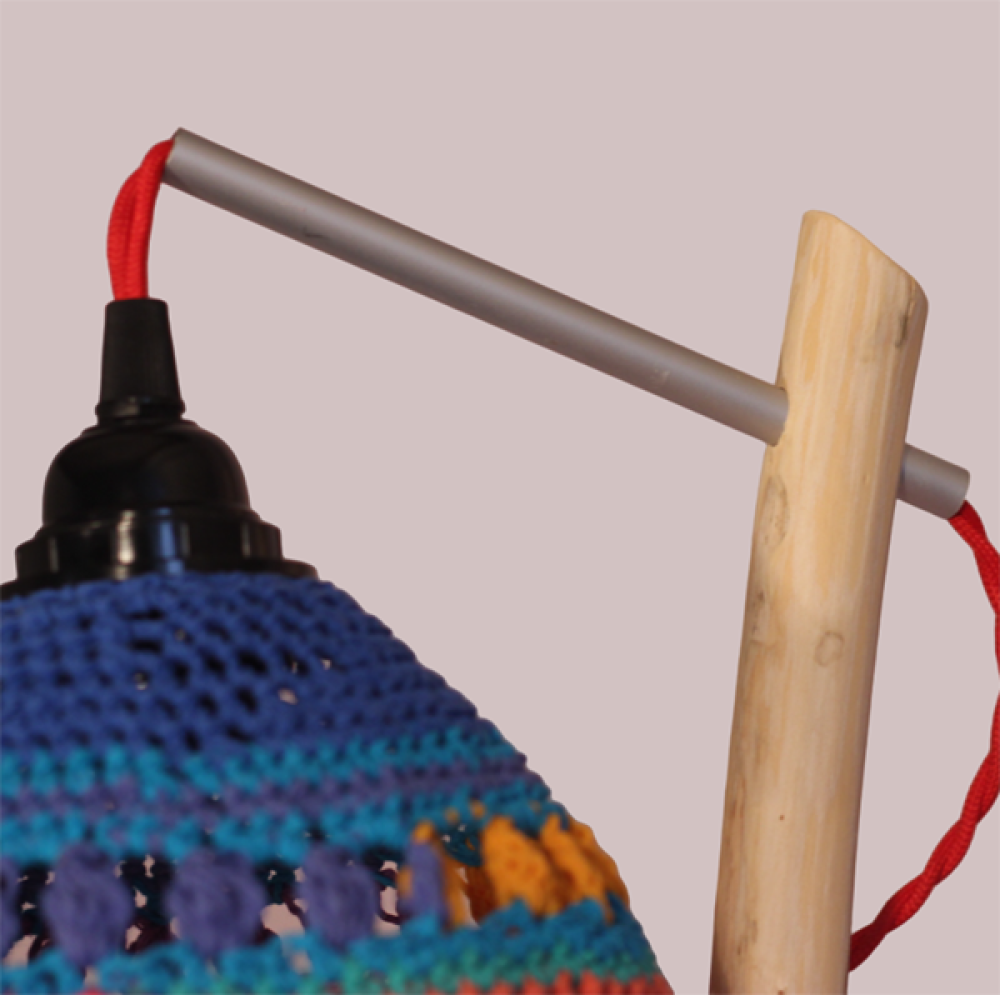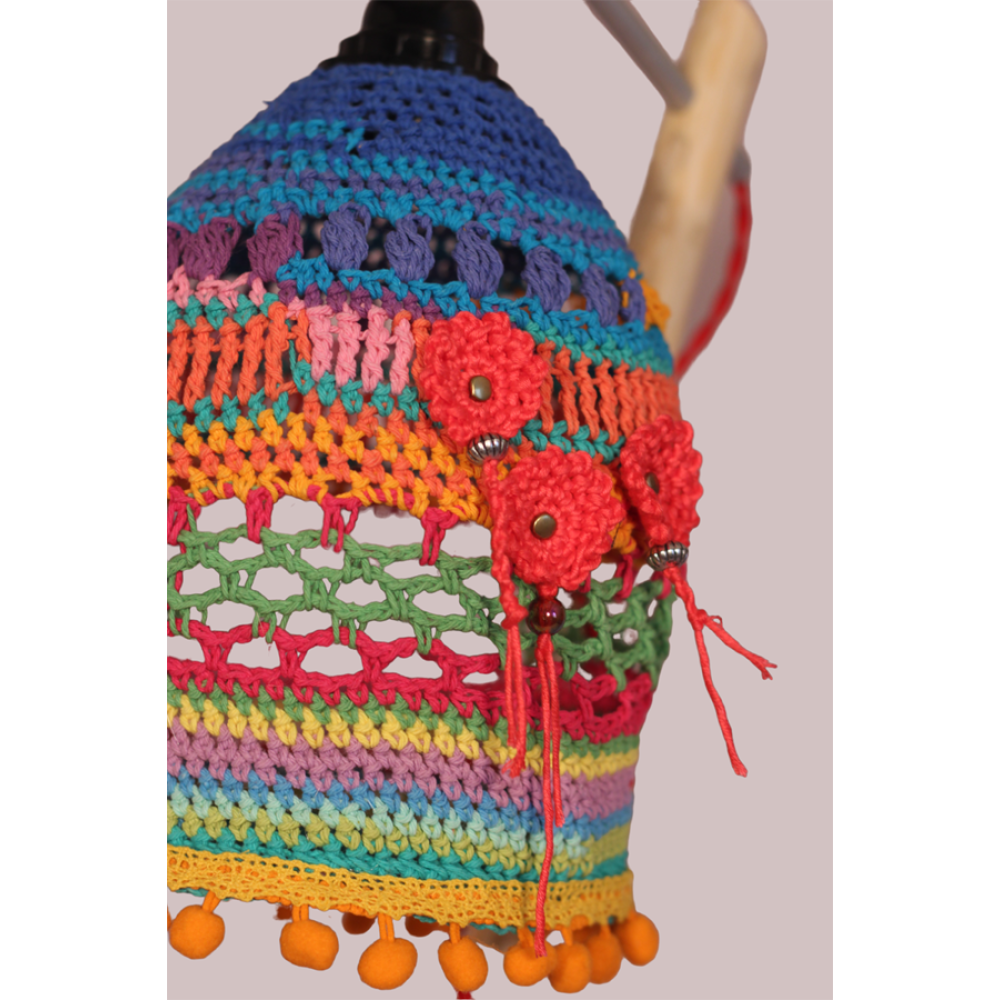 De lampenkap is gemaakt van gesteven katoenen haakwerk.