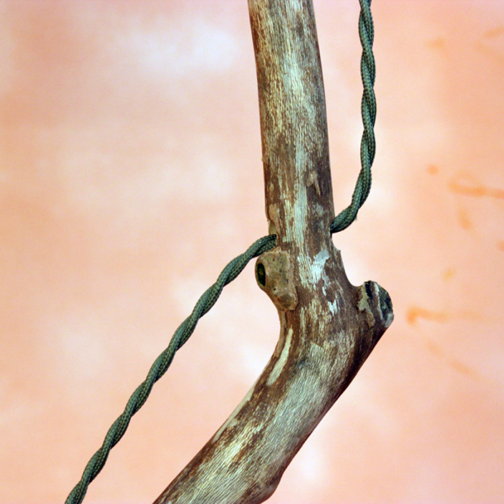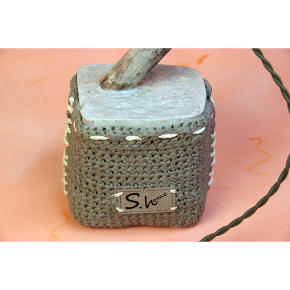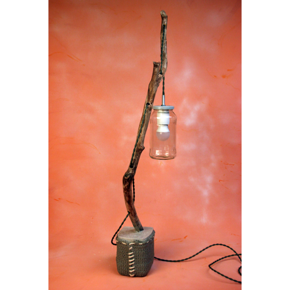 Deze lamp bestaat uit een pot van gehaakte geharde katoen, met een tak gegoten in beton.
