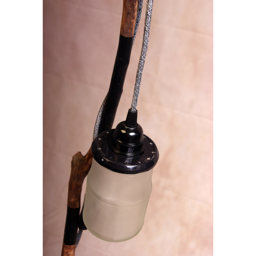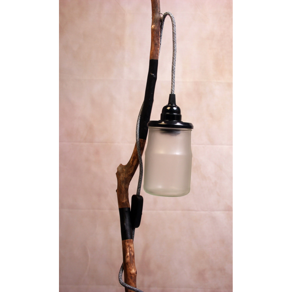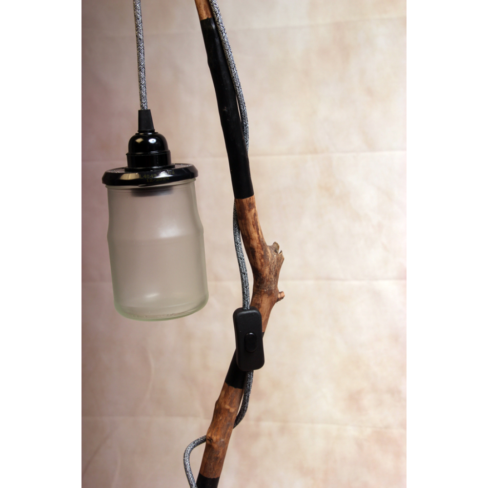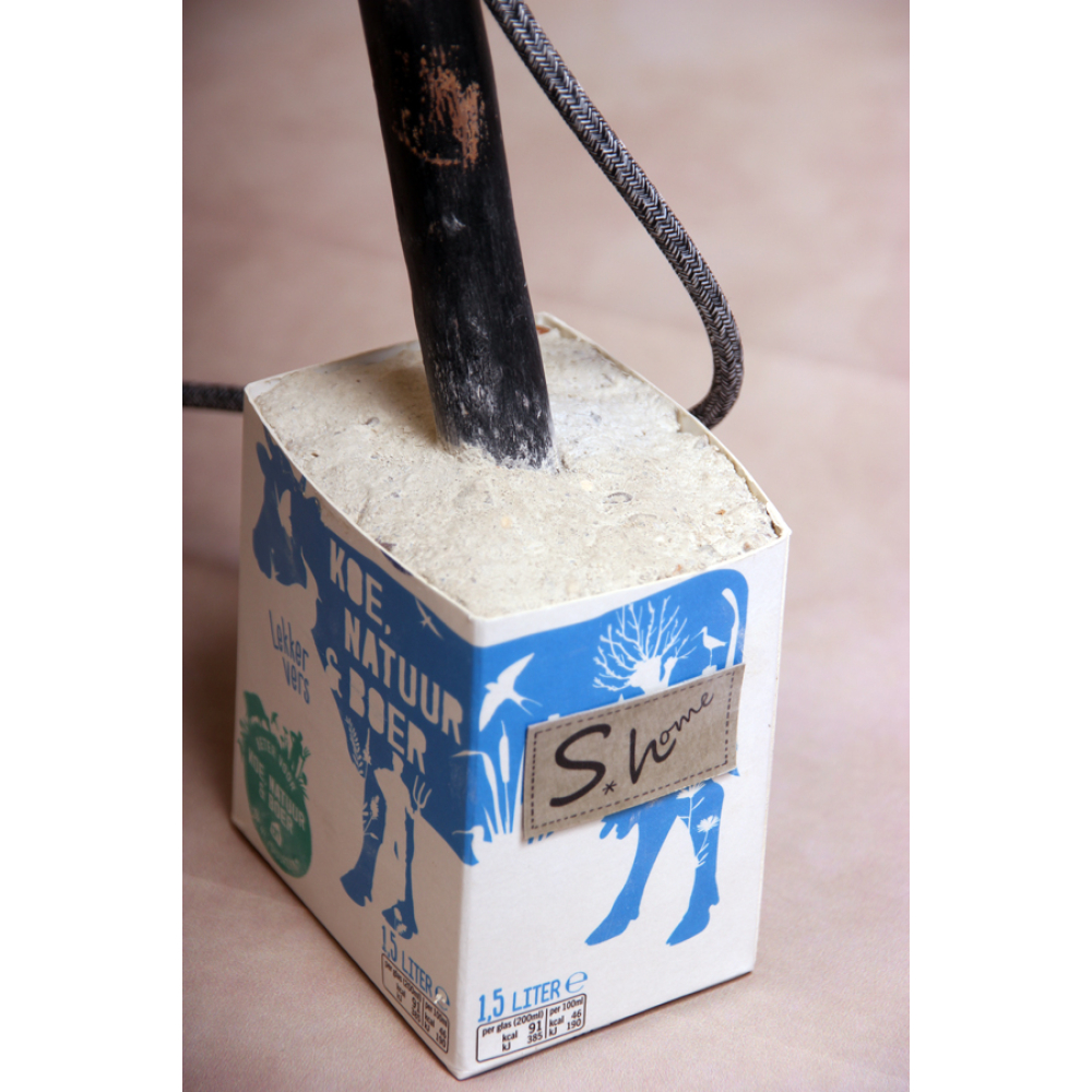 Staande lamp met tak in het beton gegoten melkpak, met glazen pot, bakeliet fitting E27 en zwart-wit snoer met schakelaar. Handmade.