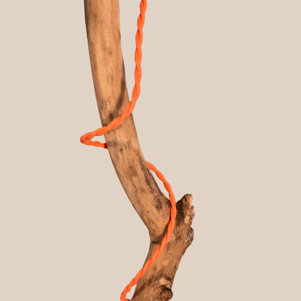 Staande lamp met voet van beton, boomstam met gehaakte en gesteven lampenkap van gerecyclede gehaakte katoen.