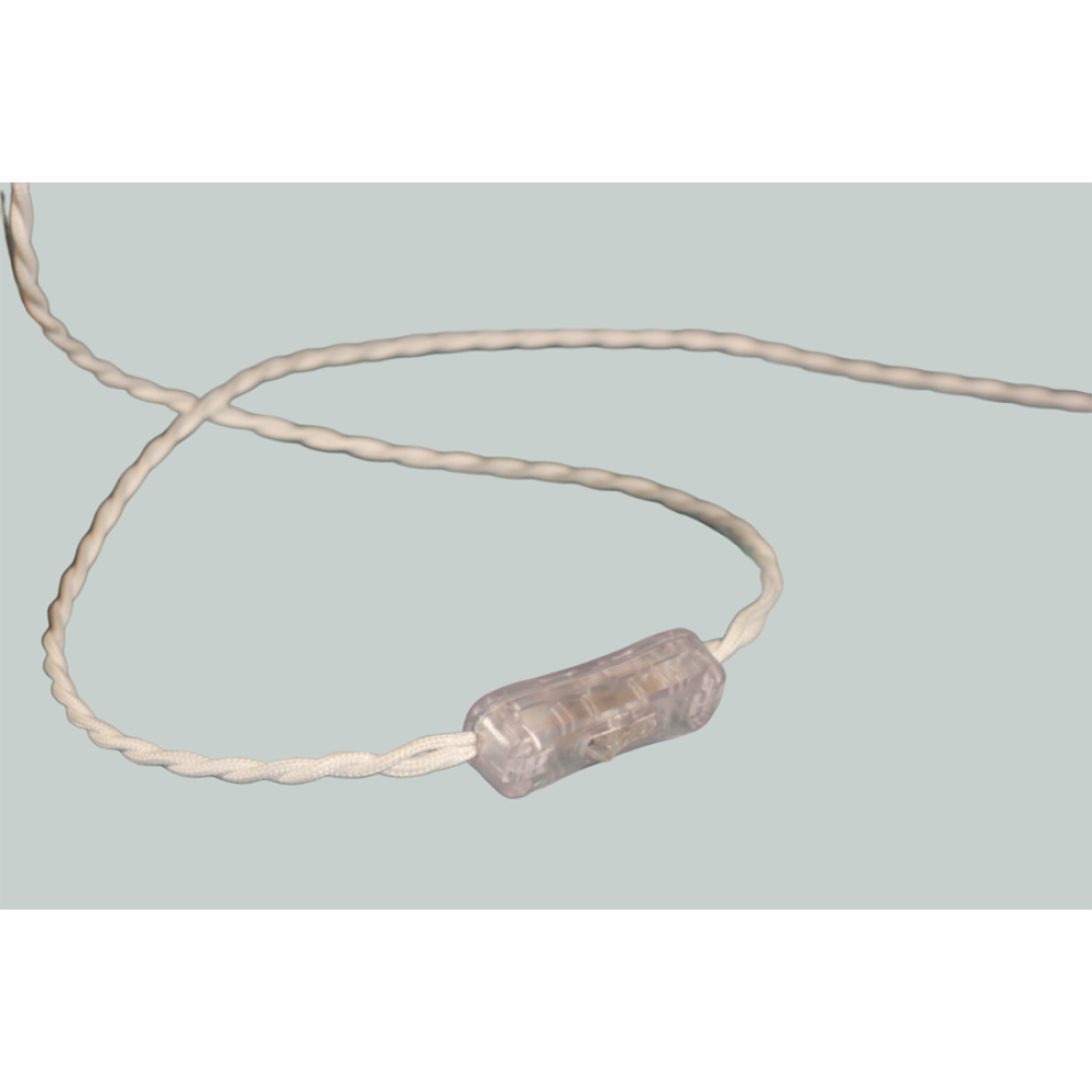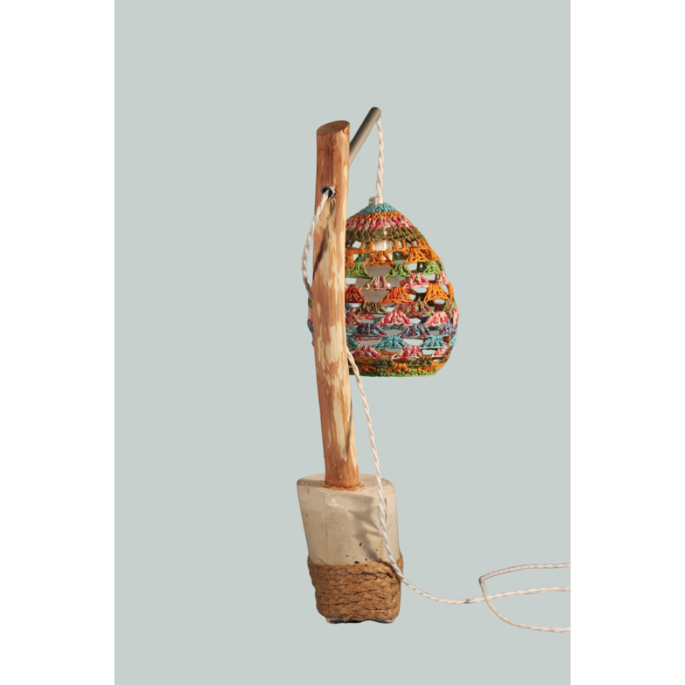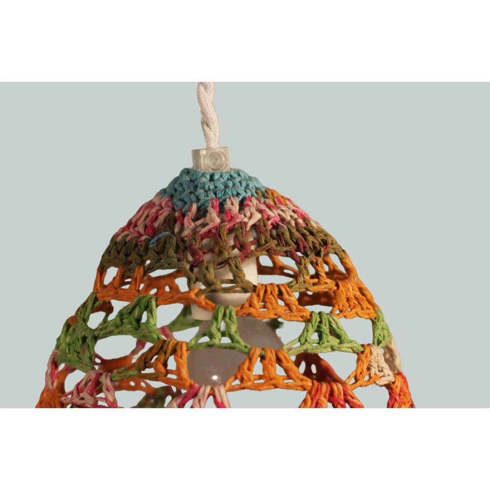 De lampenkap is van gesteven gemeleerde gehaakte katoen.