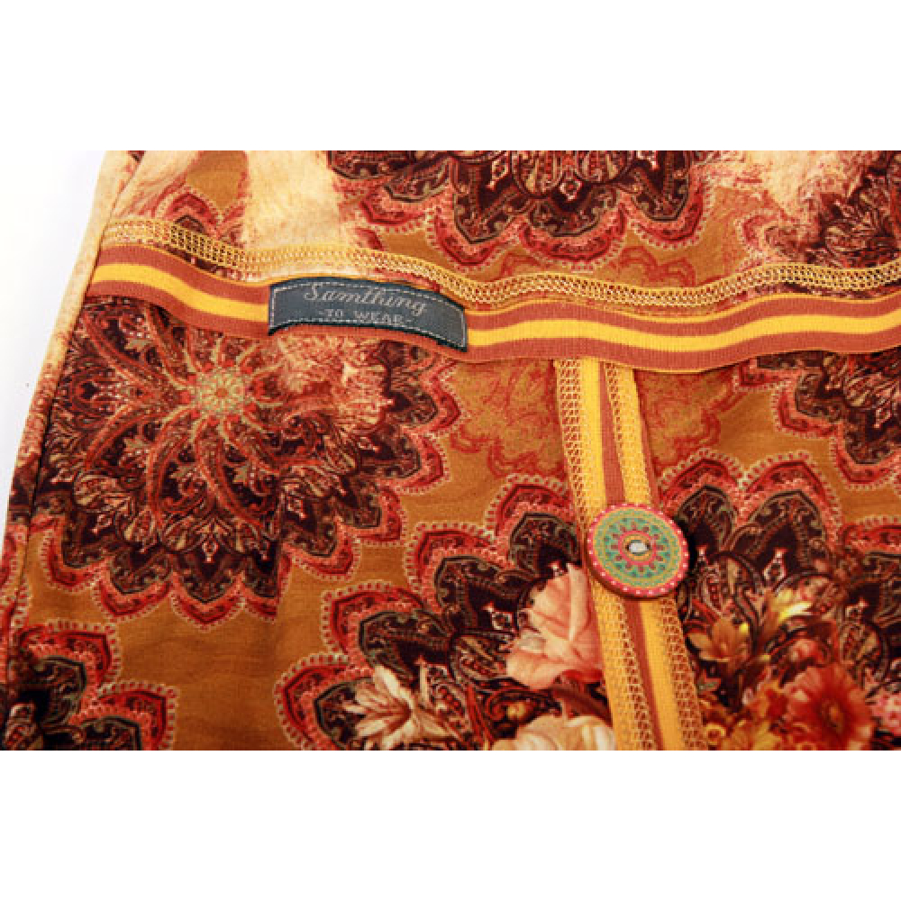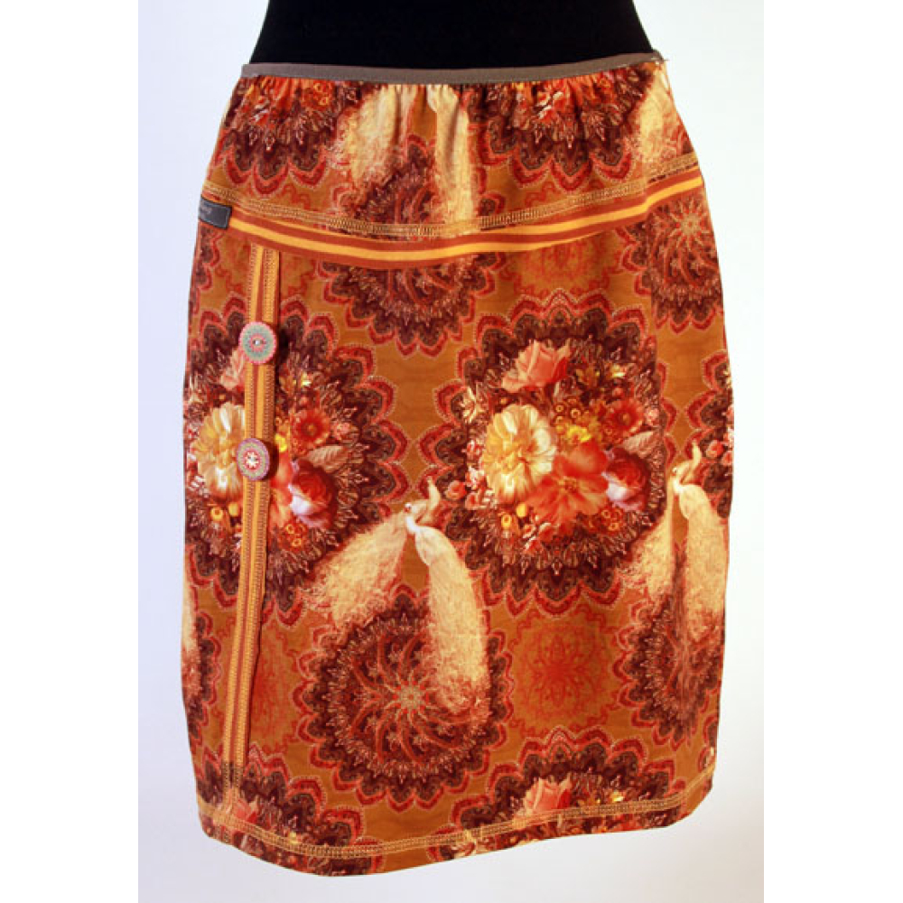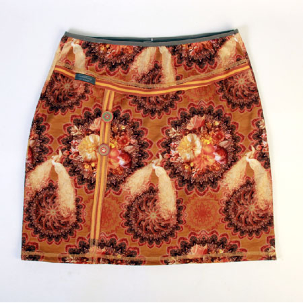 rok van tricotstof met een bronskleurige print van pauwen.