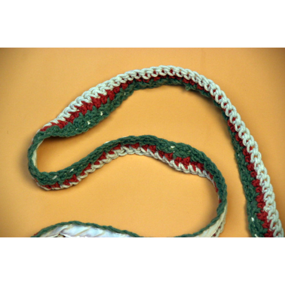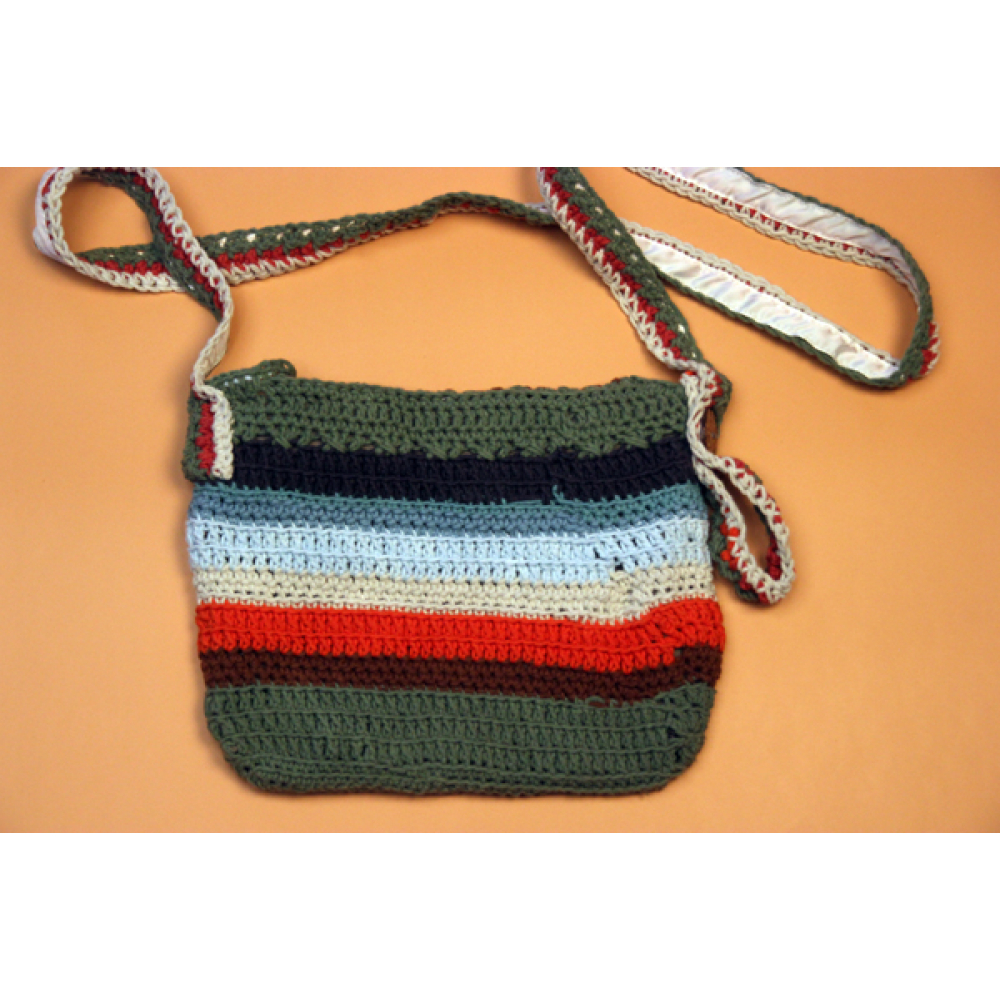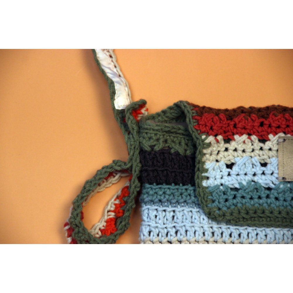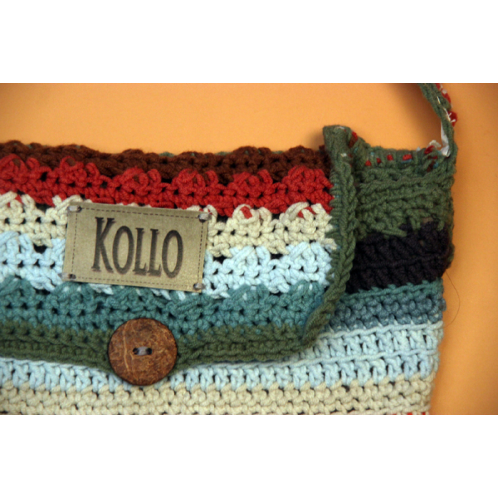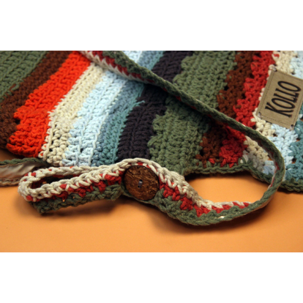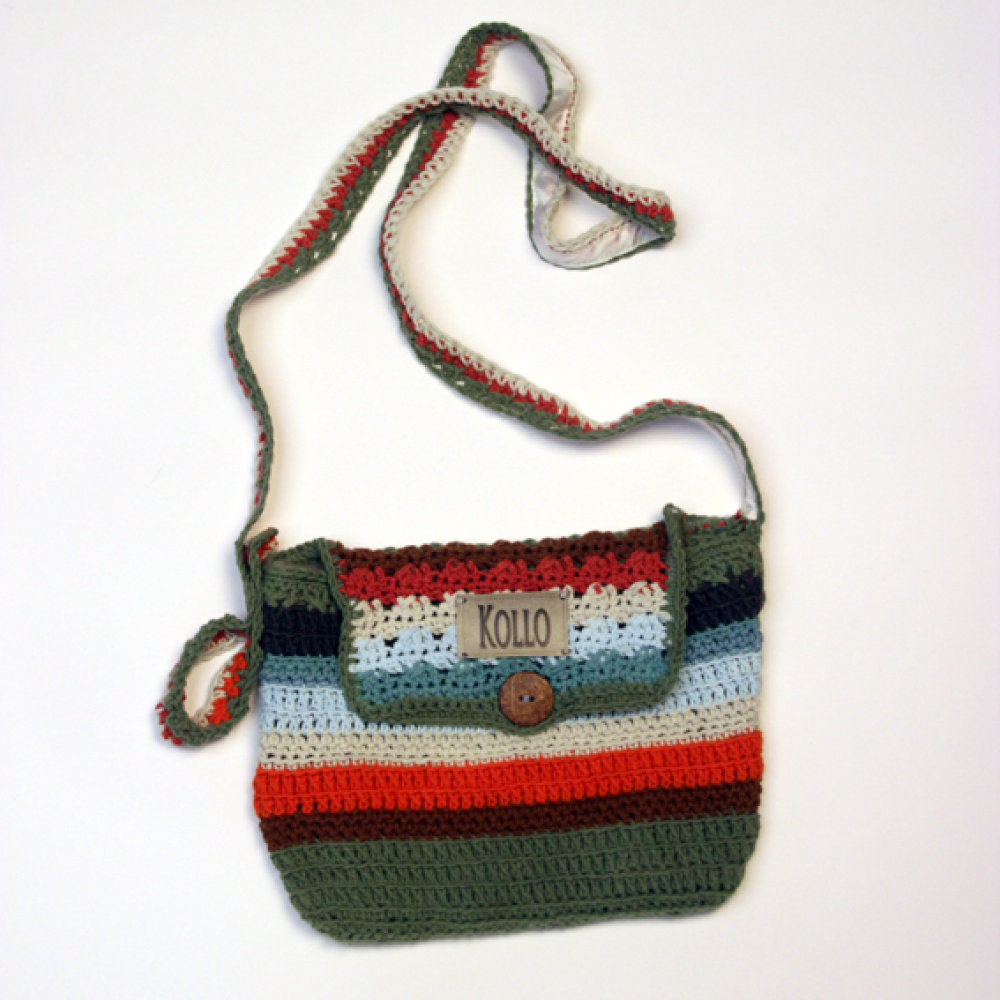 Dit handmade schoudertasje heeft een knoopsluiting en verstelbare schouderband.