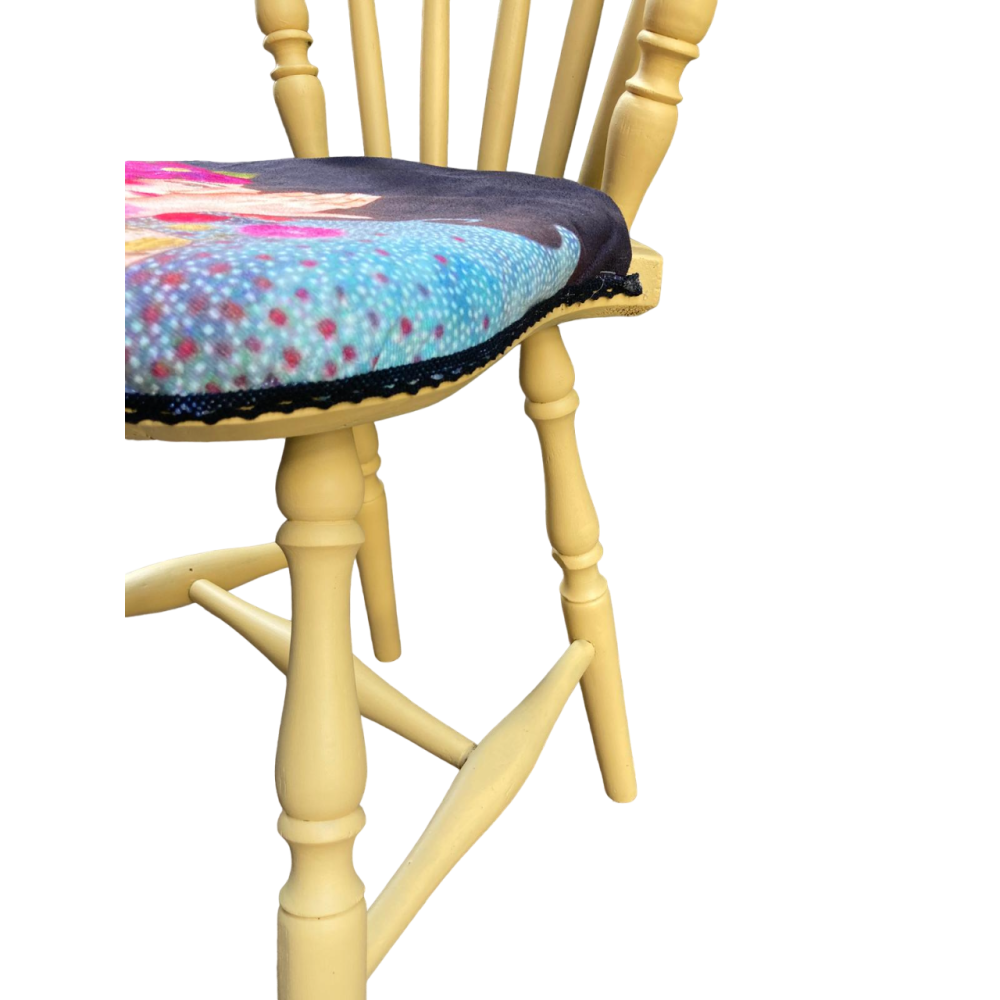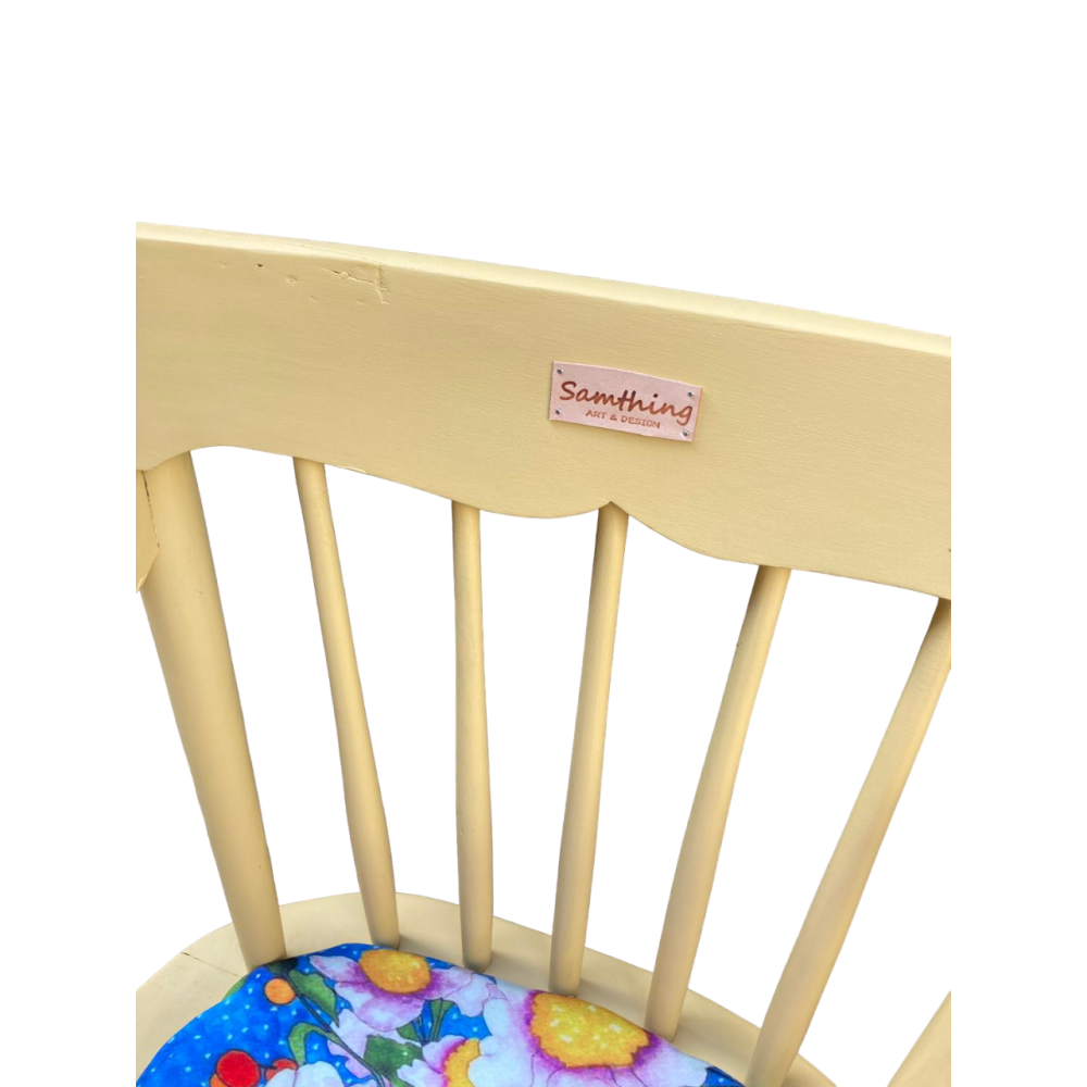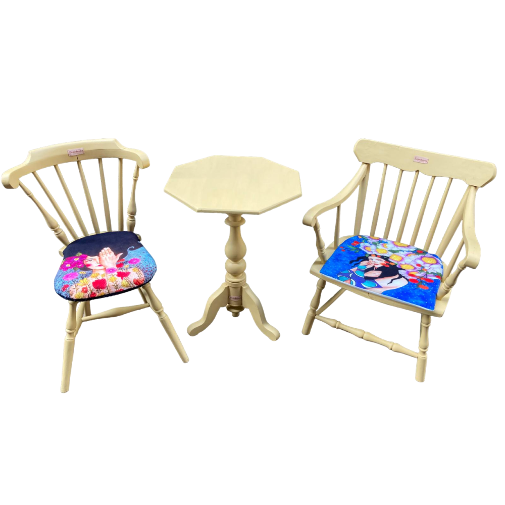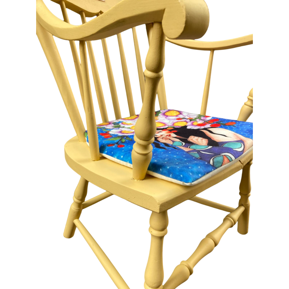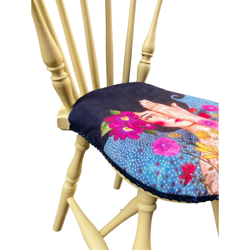 De stoel zonder armleuning heeft een vast kussen met mooie vrolijke print, en de stoel met armleuning heeft een los kussen. De kussens zijn met de hand gemaakt van een zachte fluweelachtige stof.