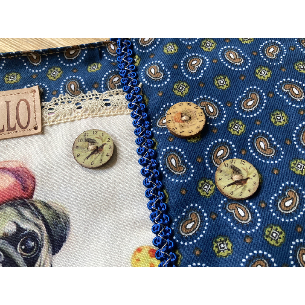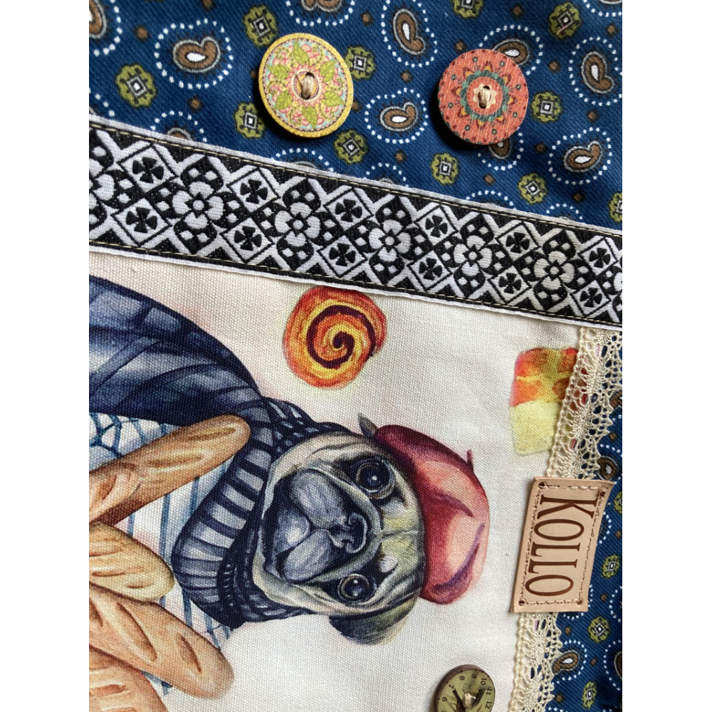 Hij is voorzien van een ritssluiting, een canvas print van hond op de voorkant en allerlei leuke details.