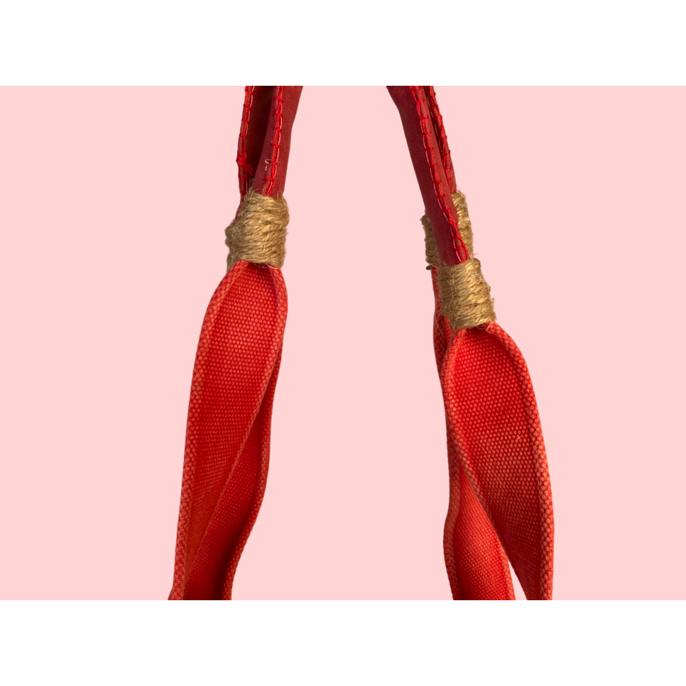 Deze gehaakte tas is gevoerd met vrolijke rode stof en heeft stevige hengsels met leertjes.