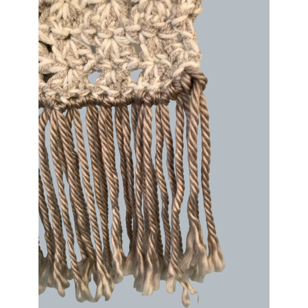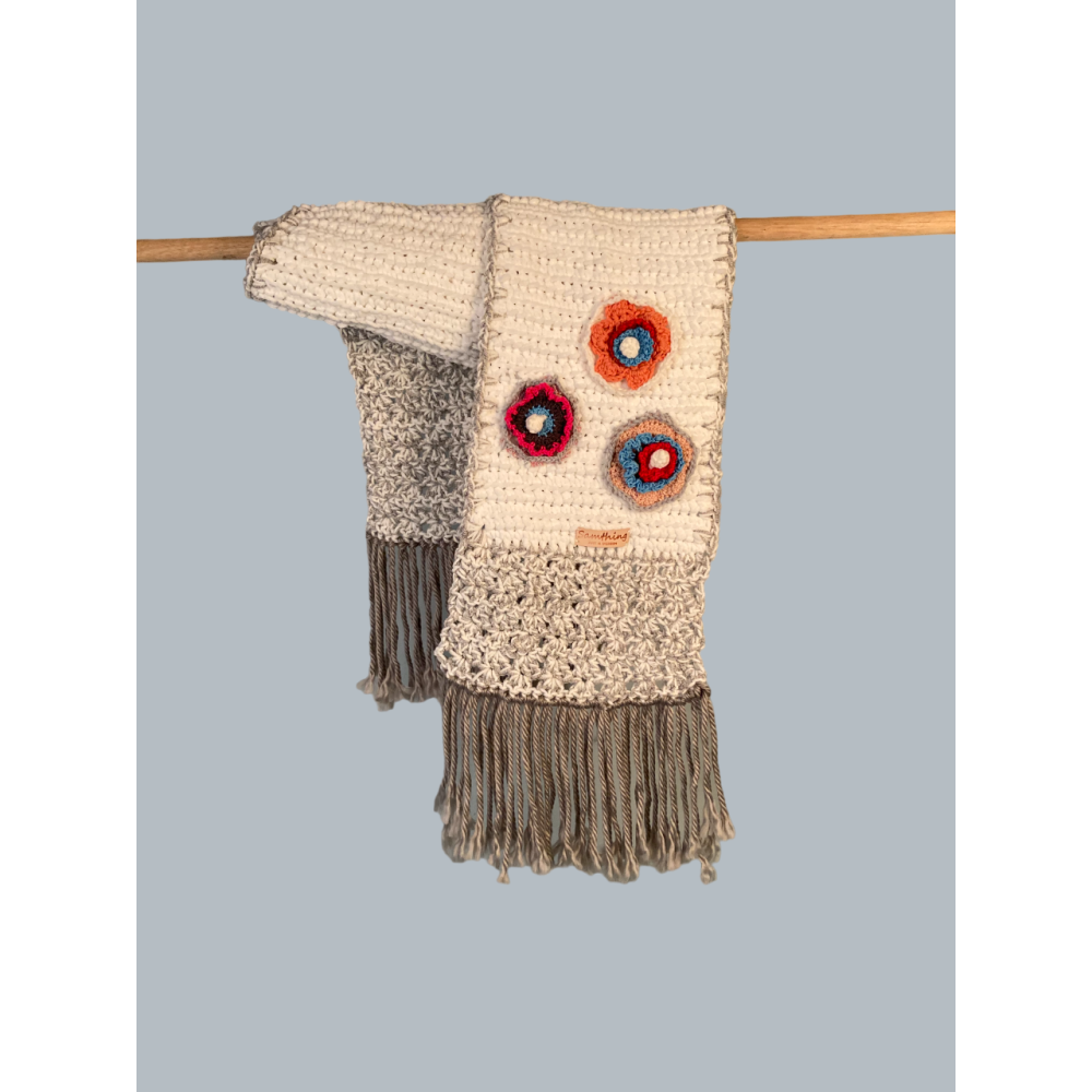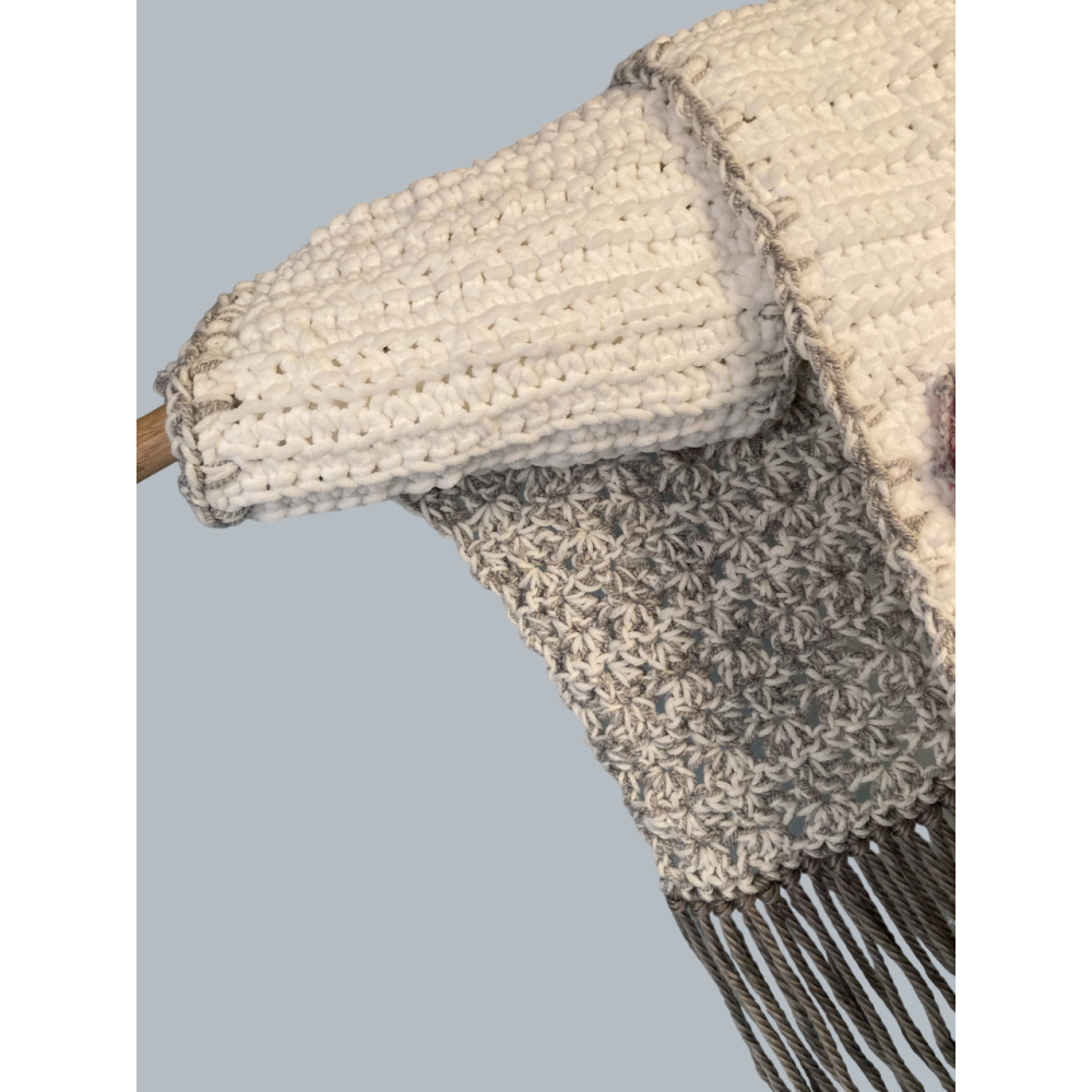 Deze sjaal is gemaakt van zachte witte chenille garen, met grijze franjes en gekleurde bloemen.