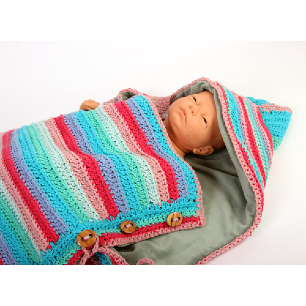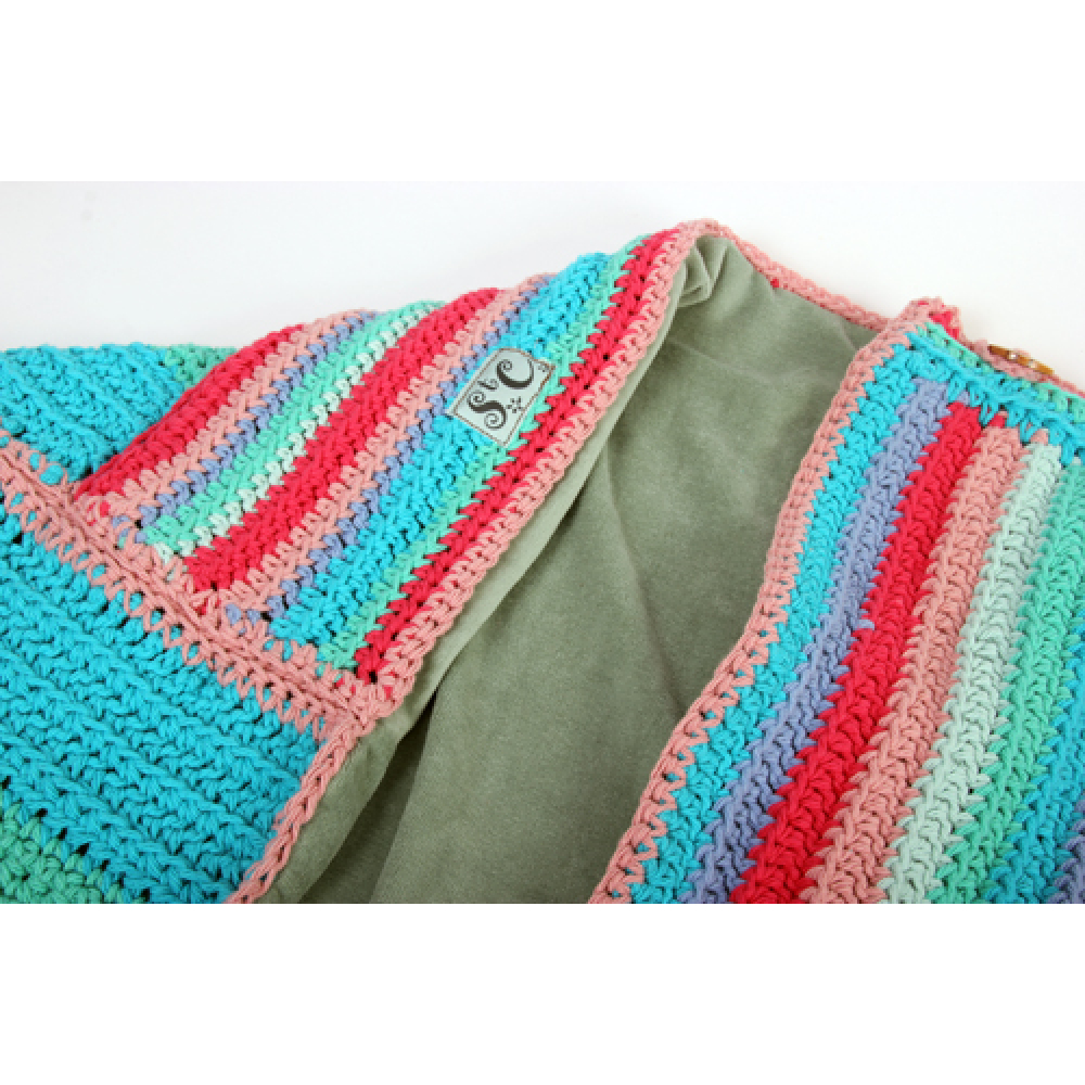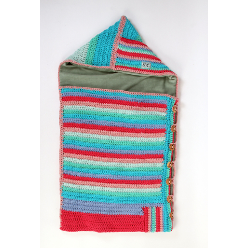 | Babyslaapzak gehaakt van 100% katoen, en gevoerd met zachte nicky velours (95% katoen, 5% polyester) met houten knoopsluiting multi color lengte: 90cm breedte: 50cm |