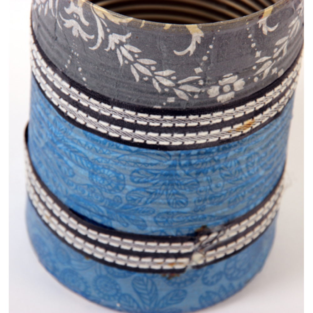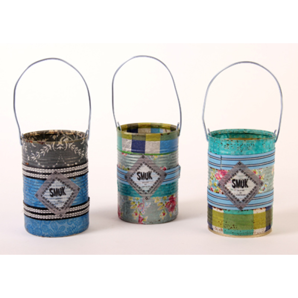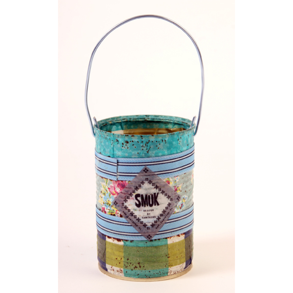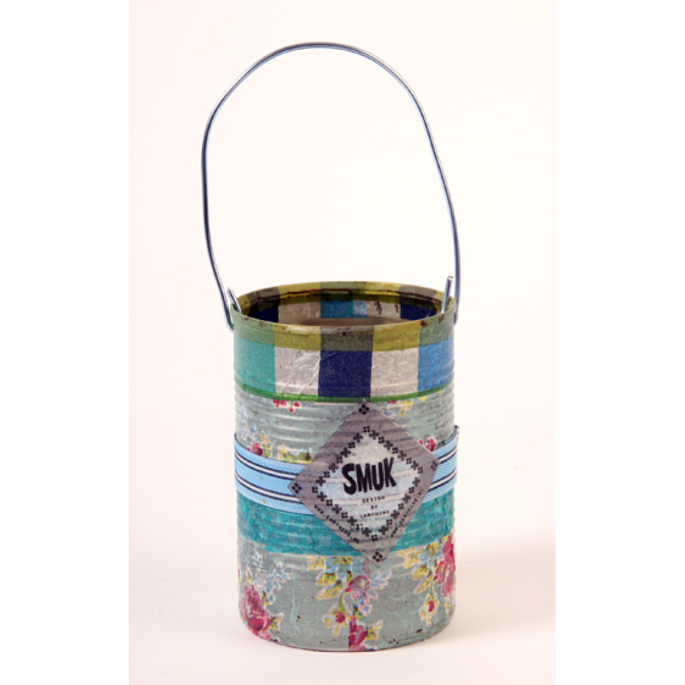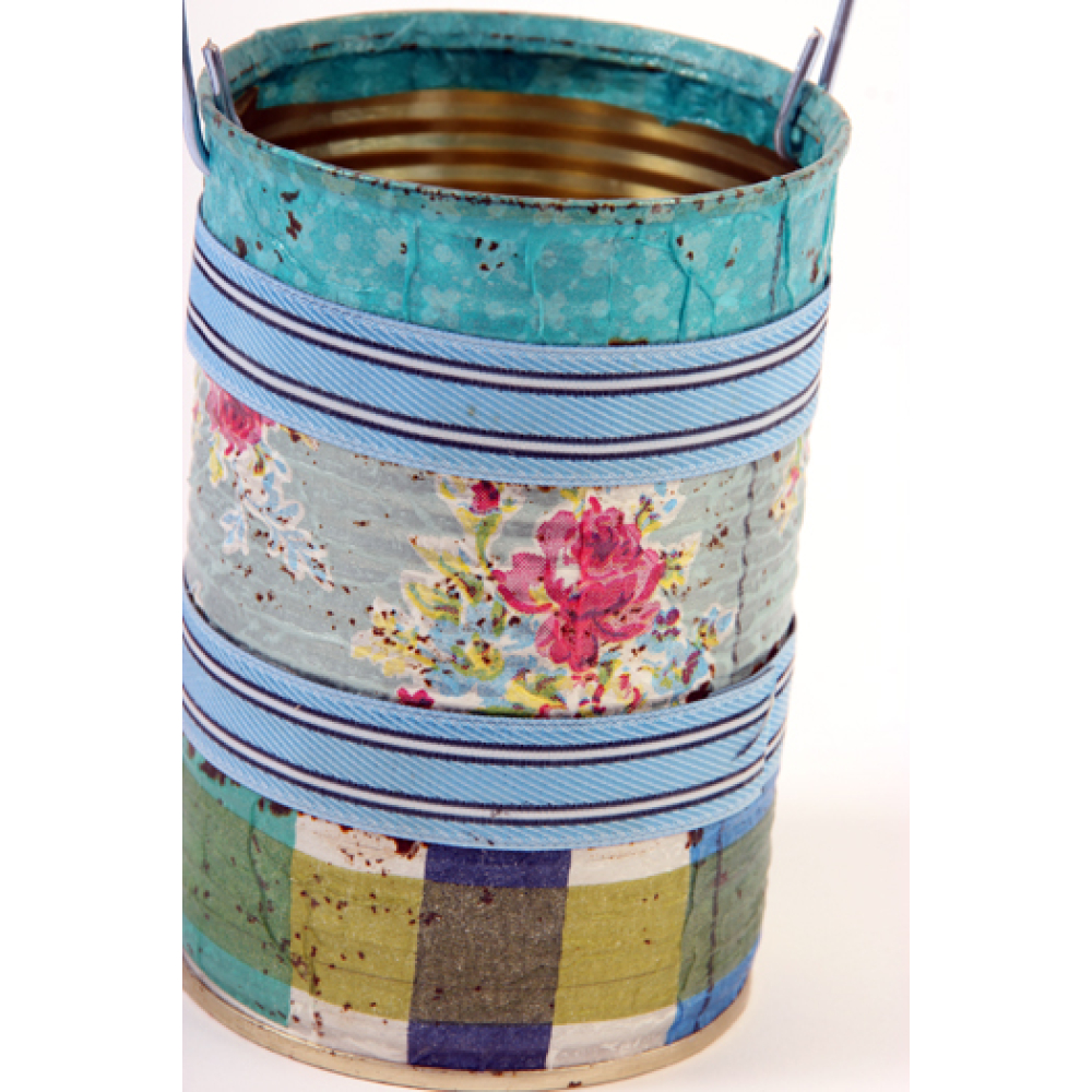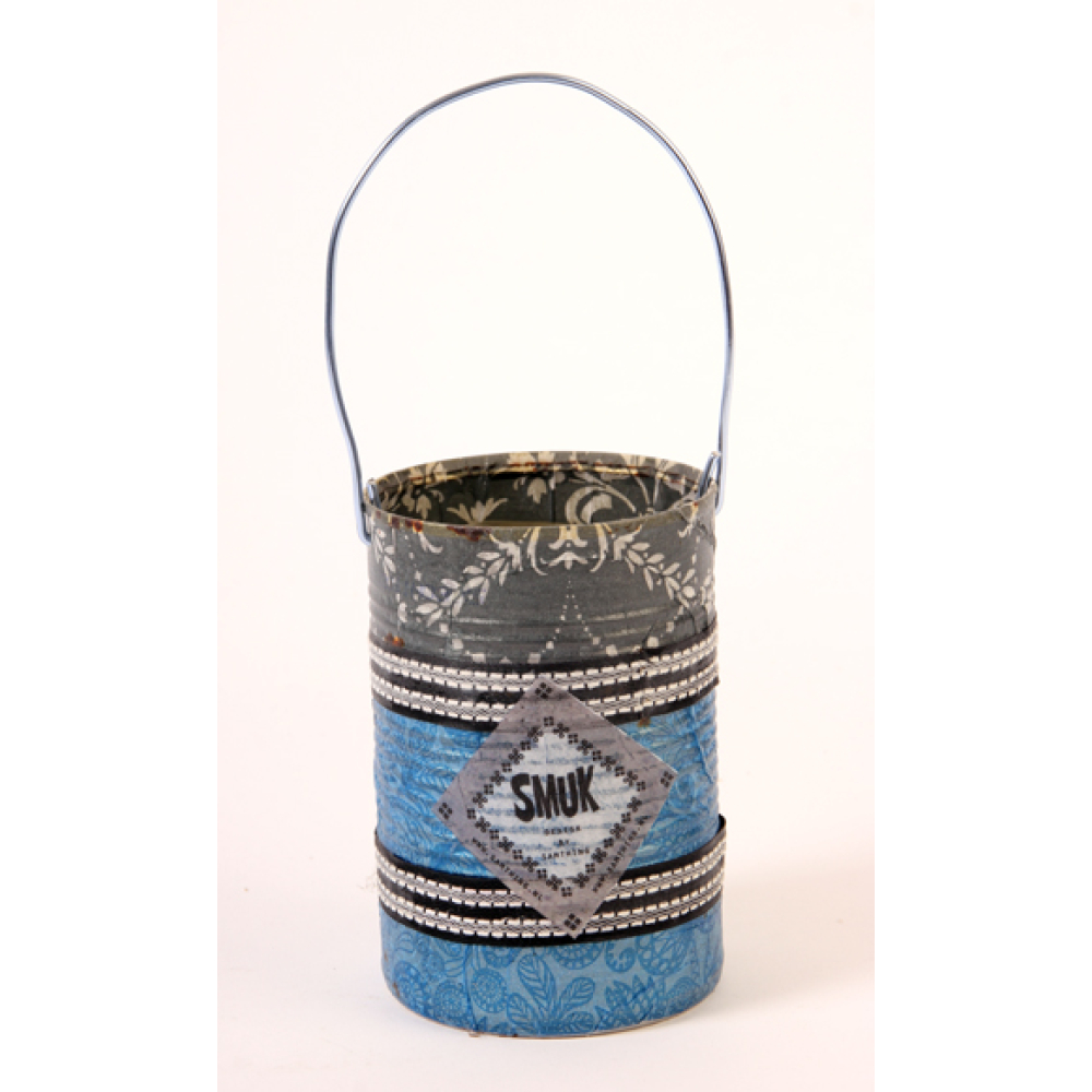 Een blikje (emmertje) om je spullen in op te bergen, gedecoreerd met decoupagetechniek.