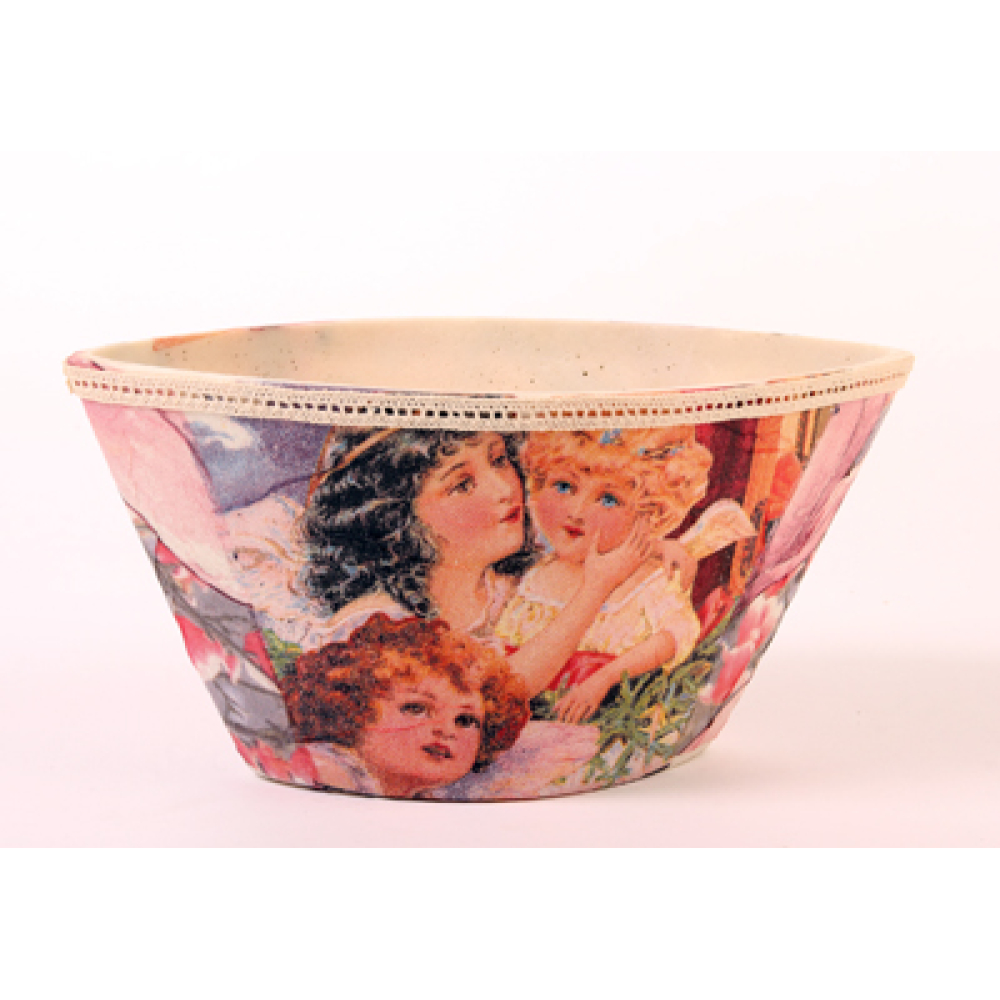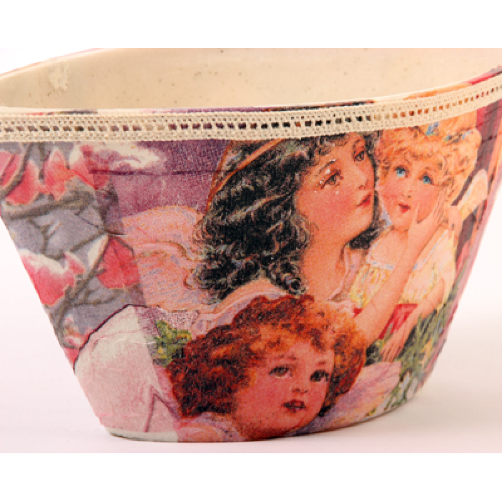Ovale aardenwerken bloempot gedecoreerd met decoupagetechniek