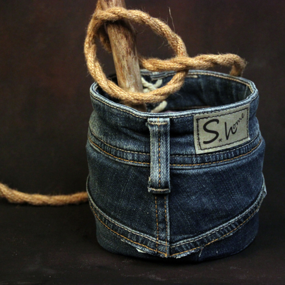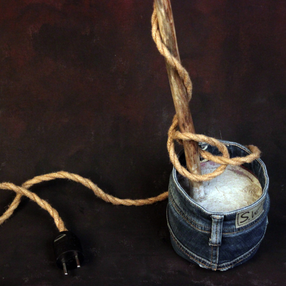 Deze stoere handmade lamp bestaat uit een robuuste tak in een pot van gehard denim, gevuld met beton voor de stabiliteit.