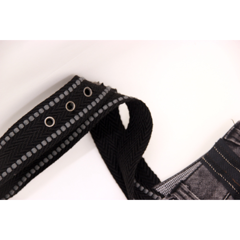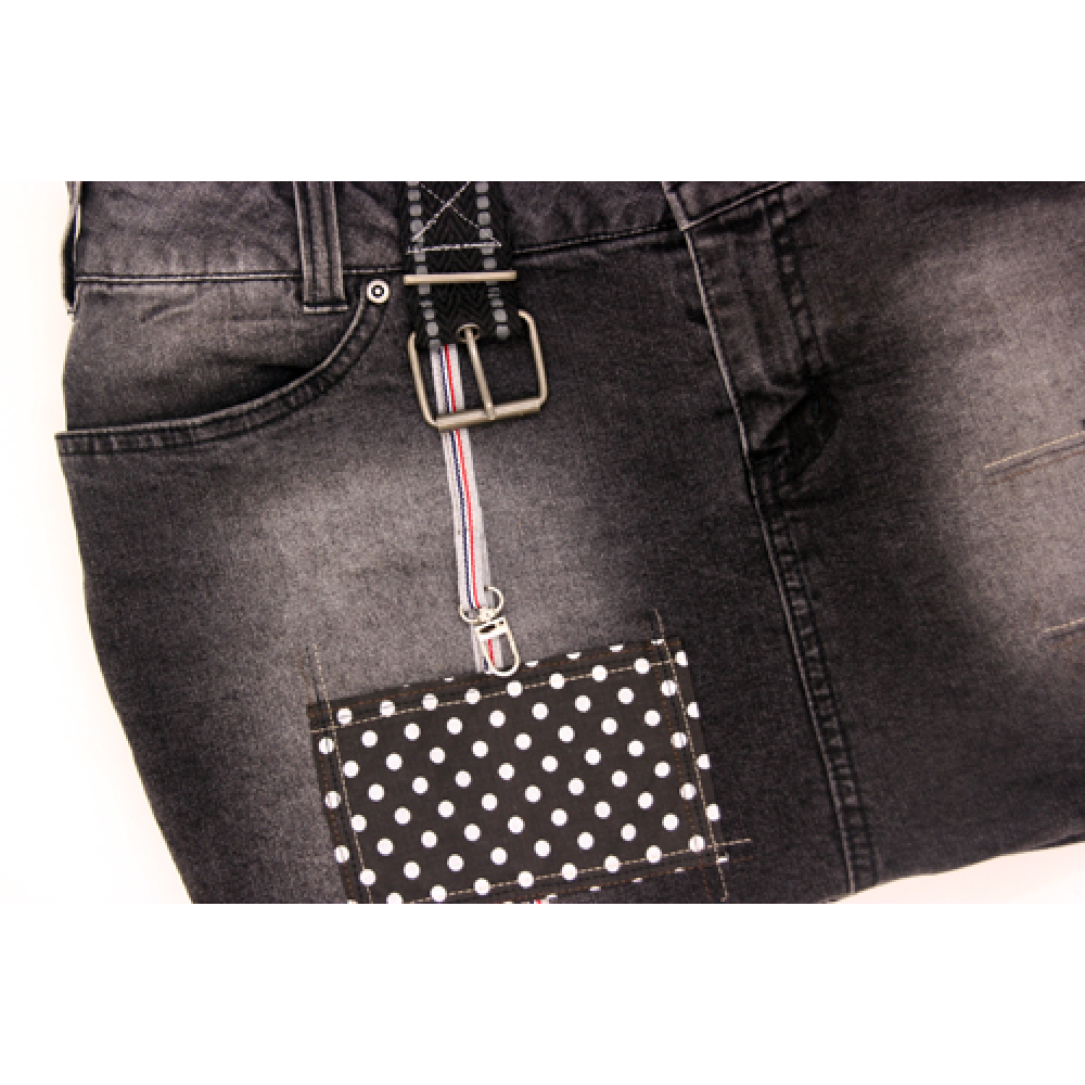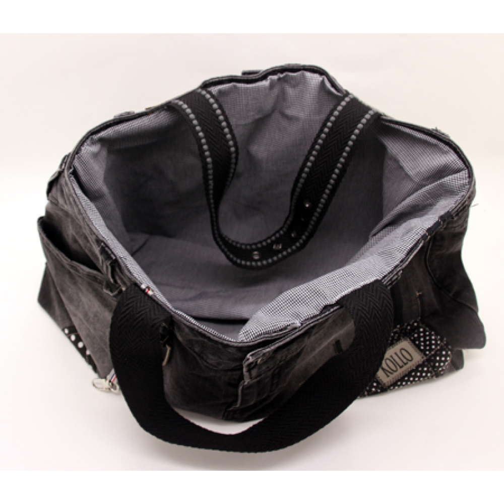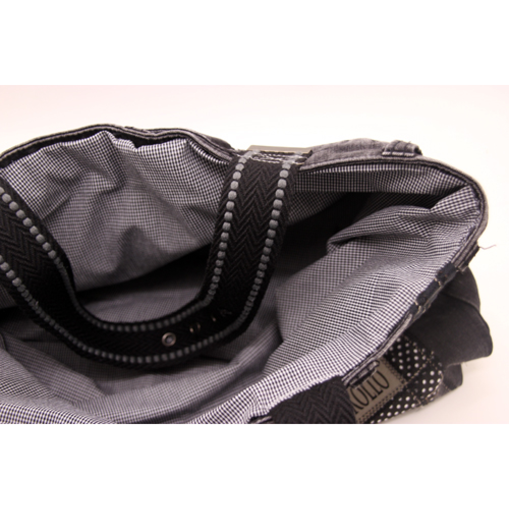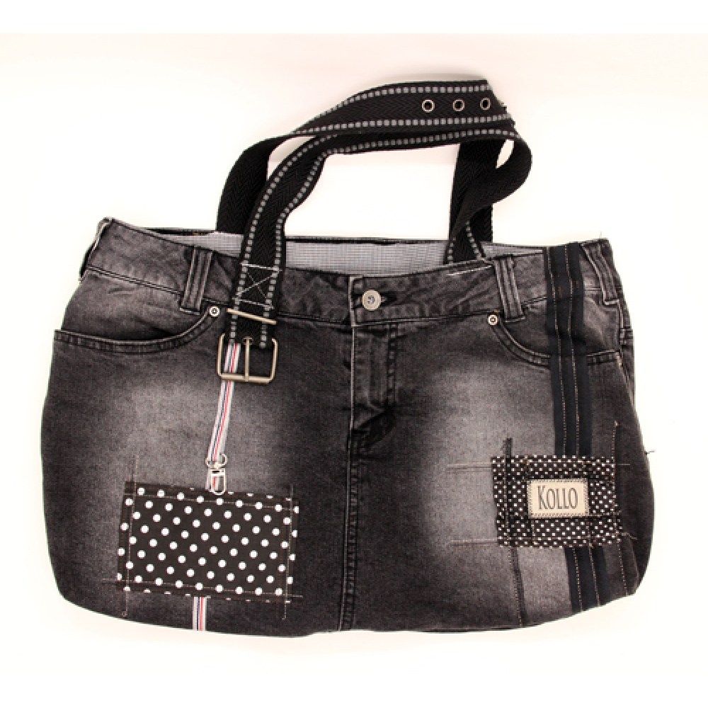 Shopper gemaakt van gebruikte jeans met sierstiksels en opgestikte stukken.
