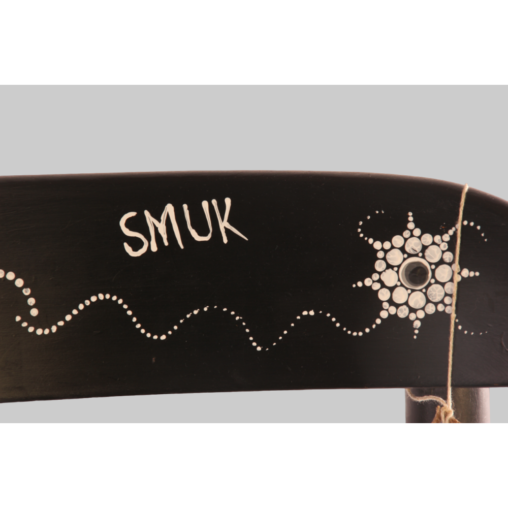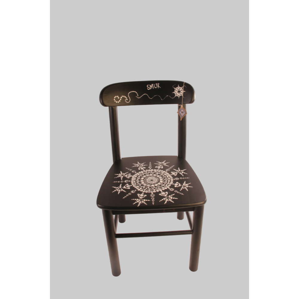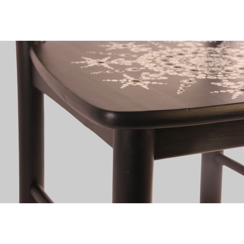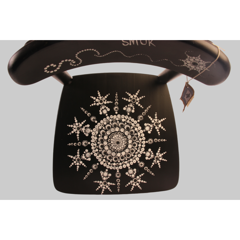 Houten geüpcyclede stoel in mat zwart geverfd met dot art mandala.