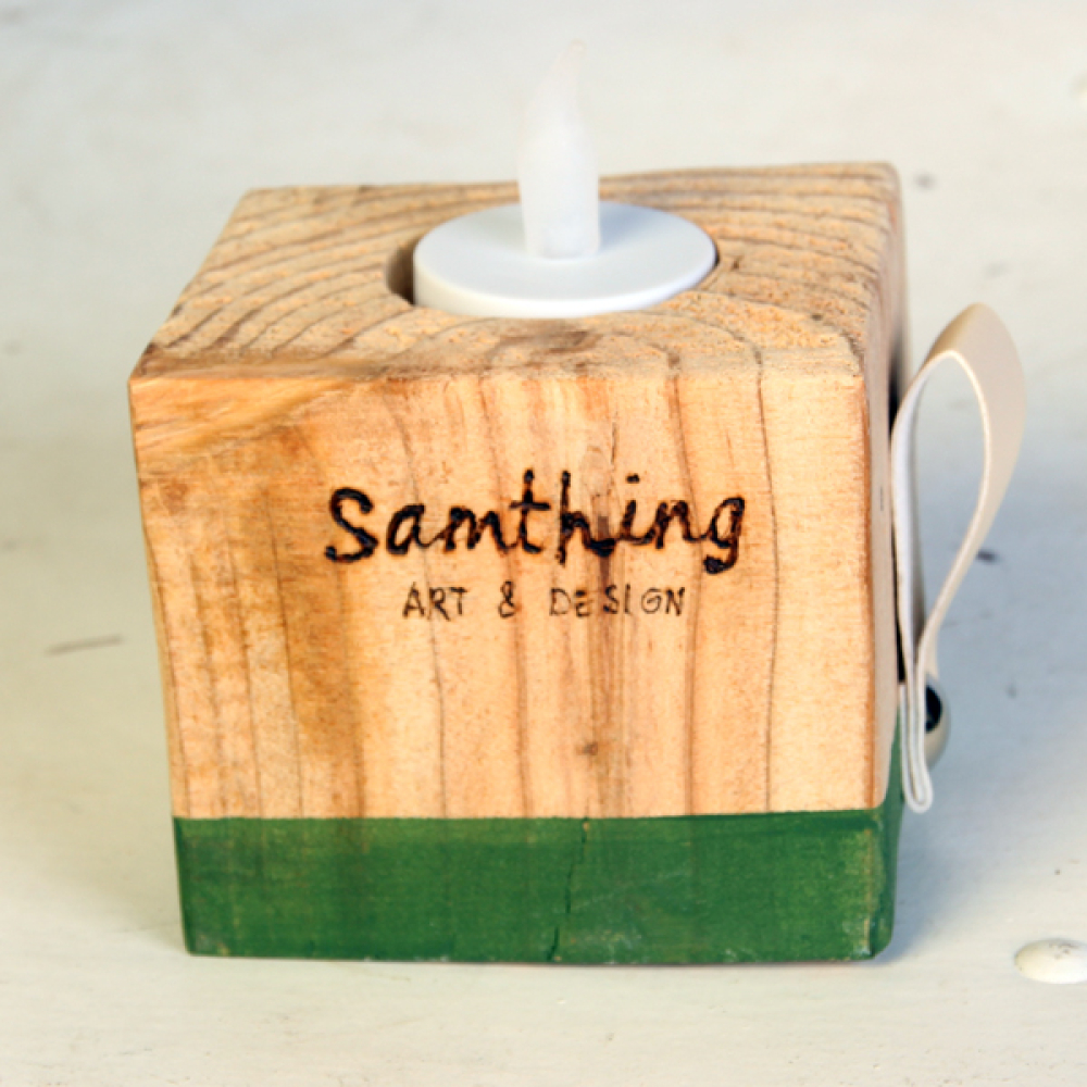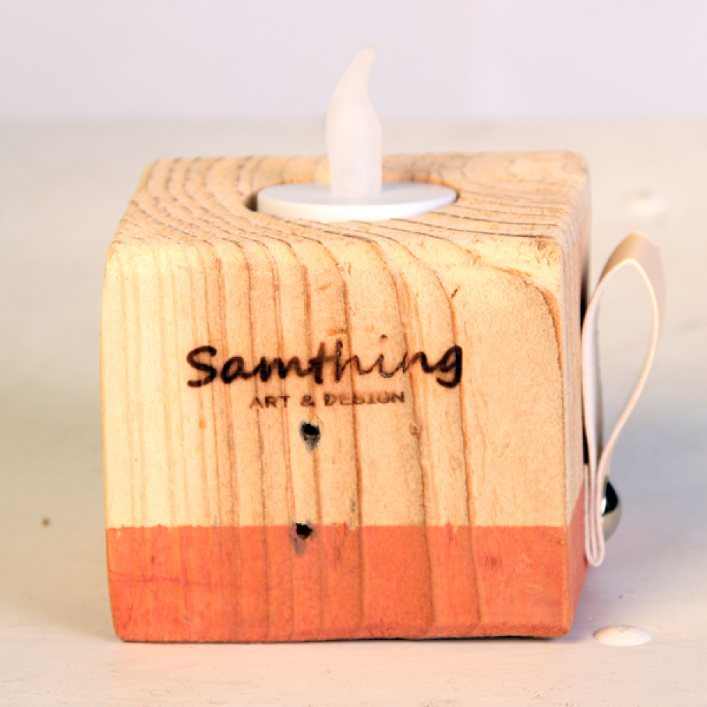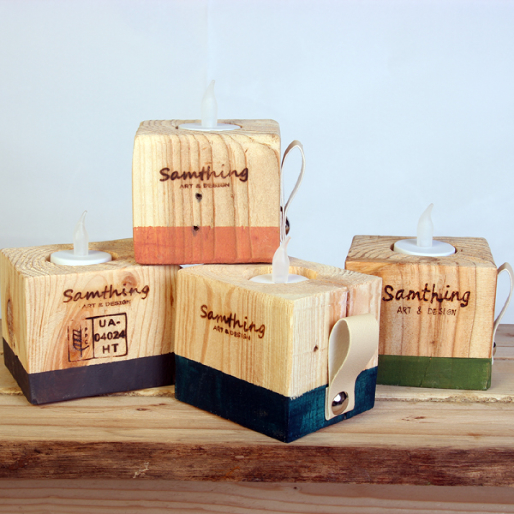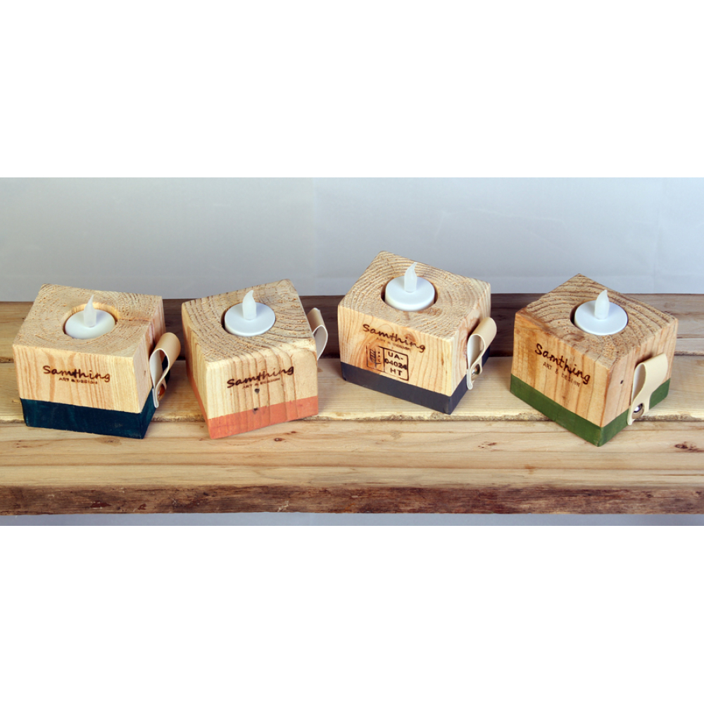 Houten waxinehouders gemaakt van gebruikte pallets.