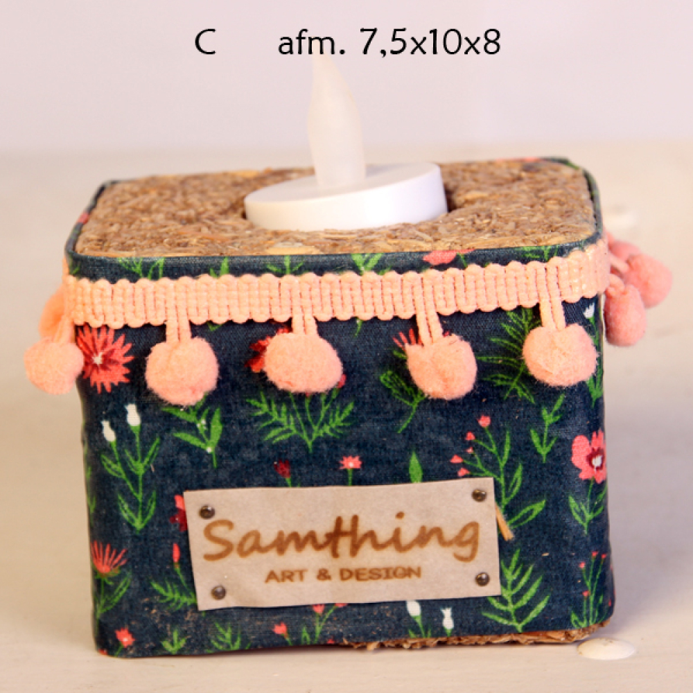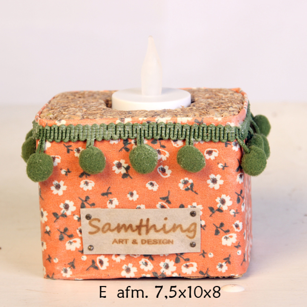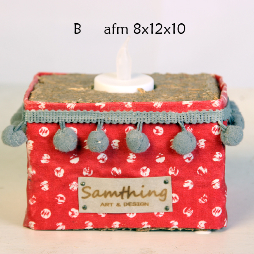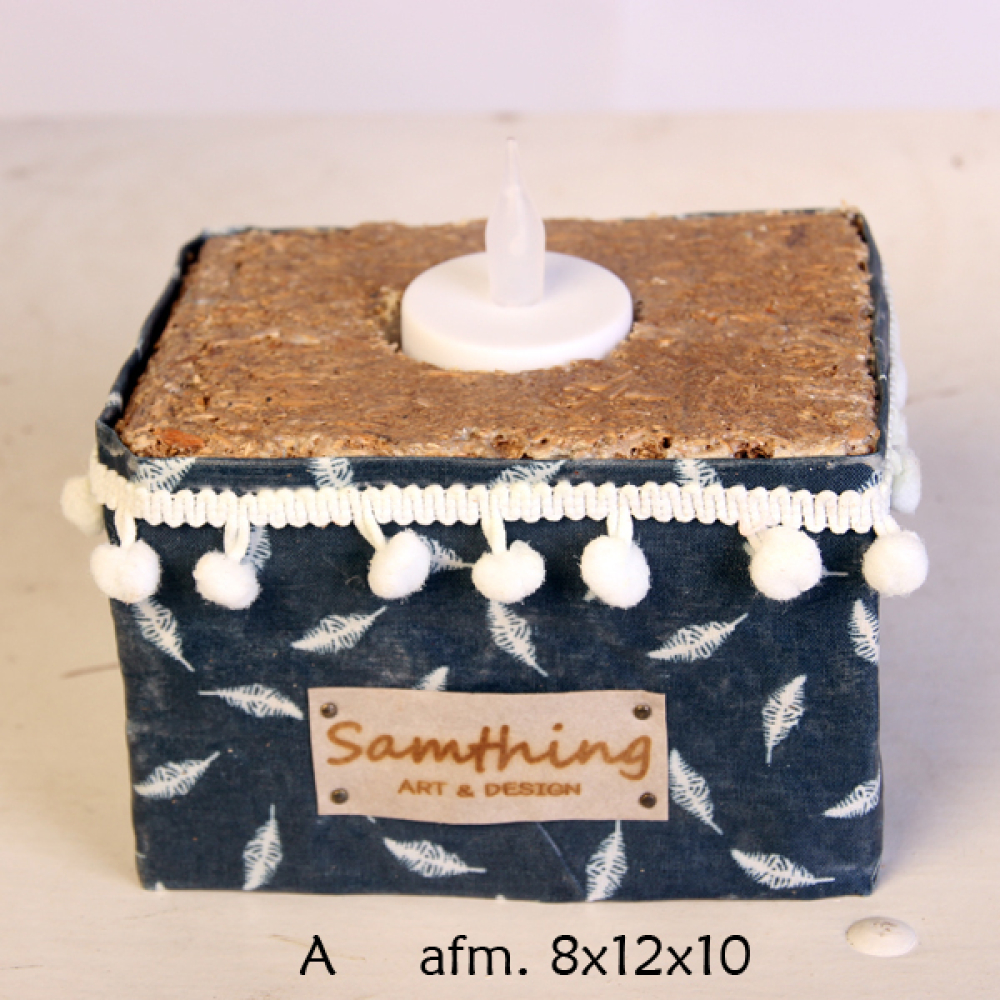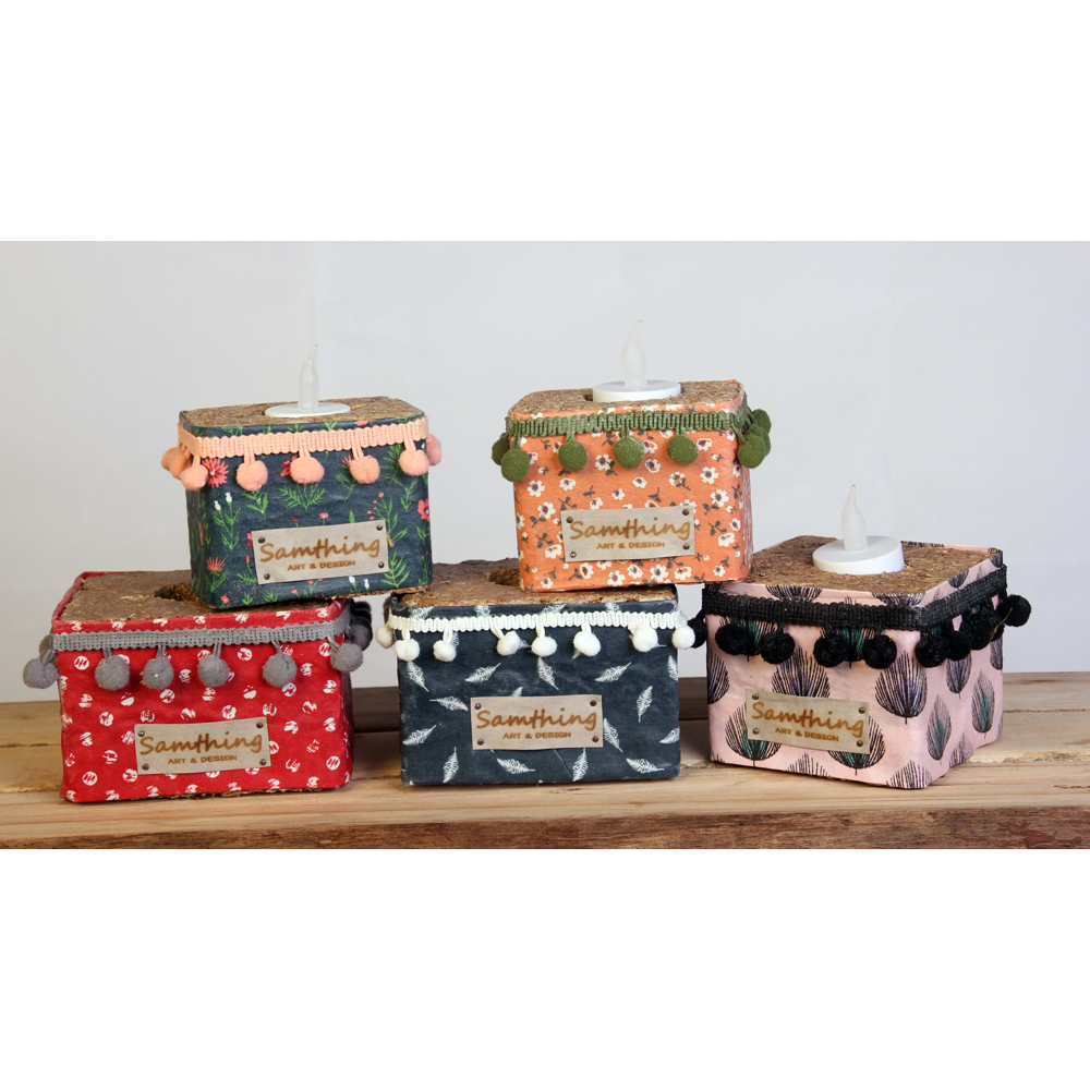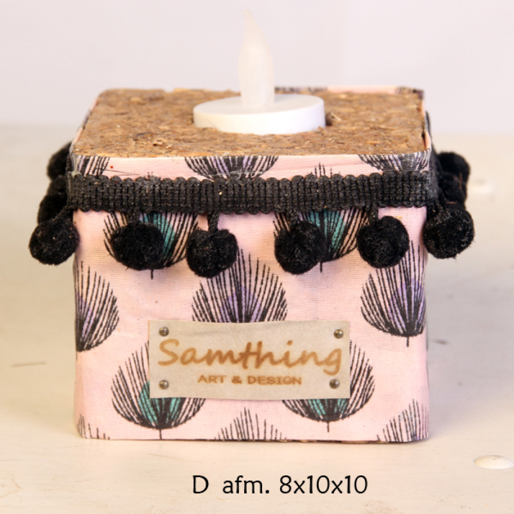 Vrolijke waxinehouders gemaakt van geperst hout (gebruikte pallets), omwikkeld met geharde dessin stof,
